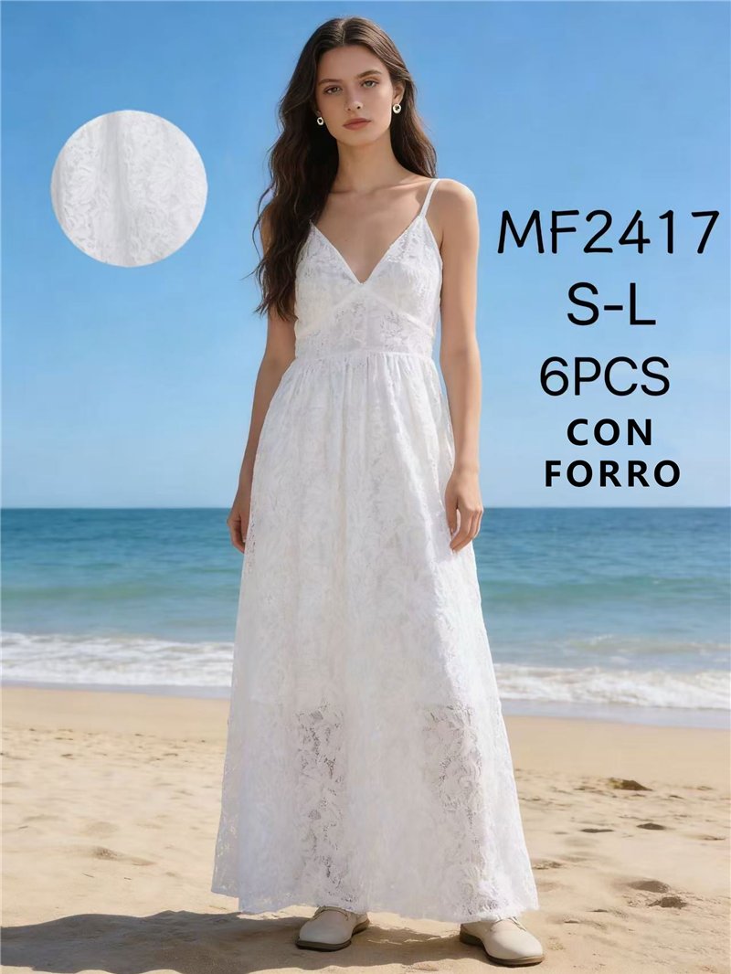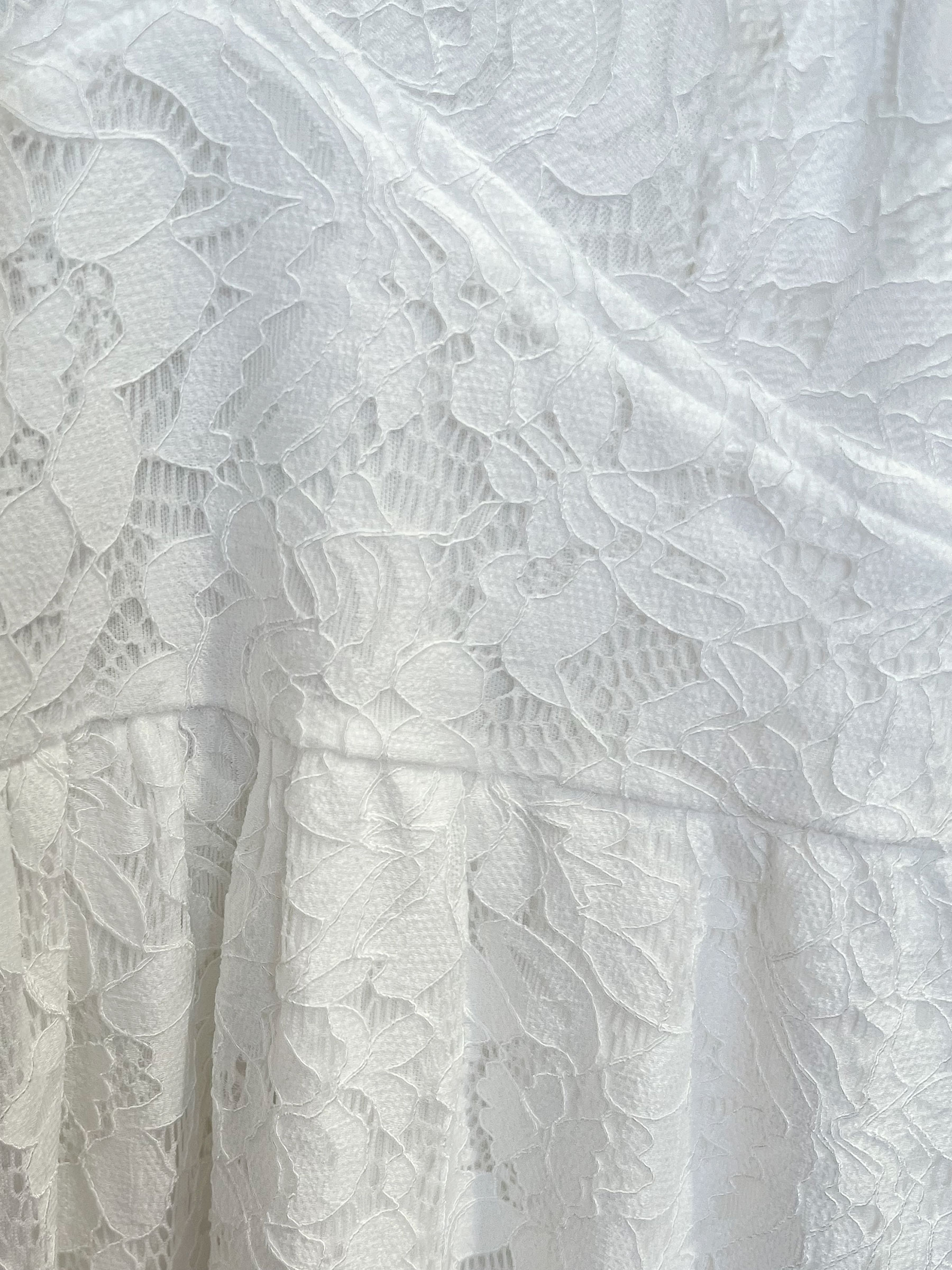 Lace maxi dress. Deep V neckline. Slim straps. Fully lined body. Sheer hem finish.