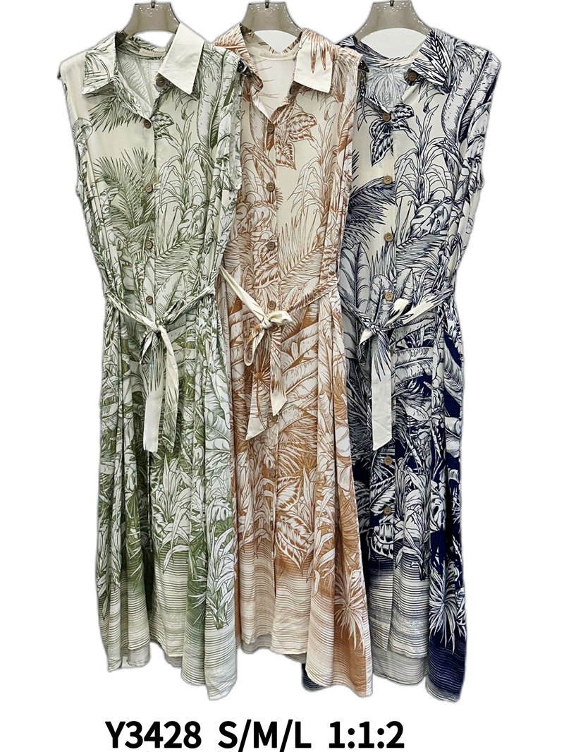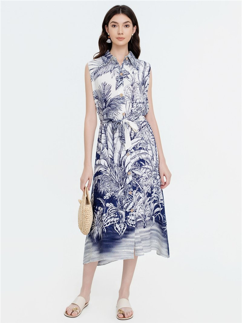 Tropical print belted midi shirt dress