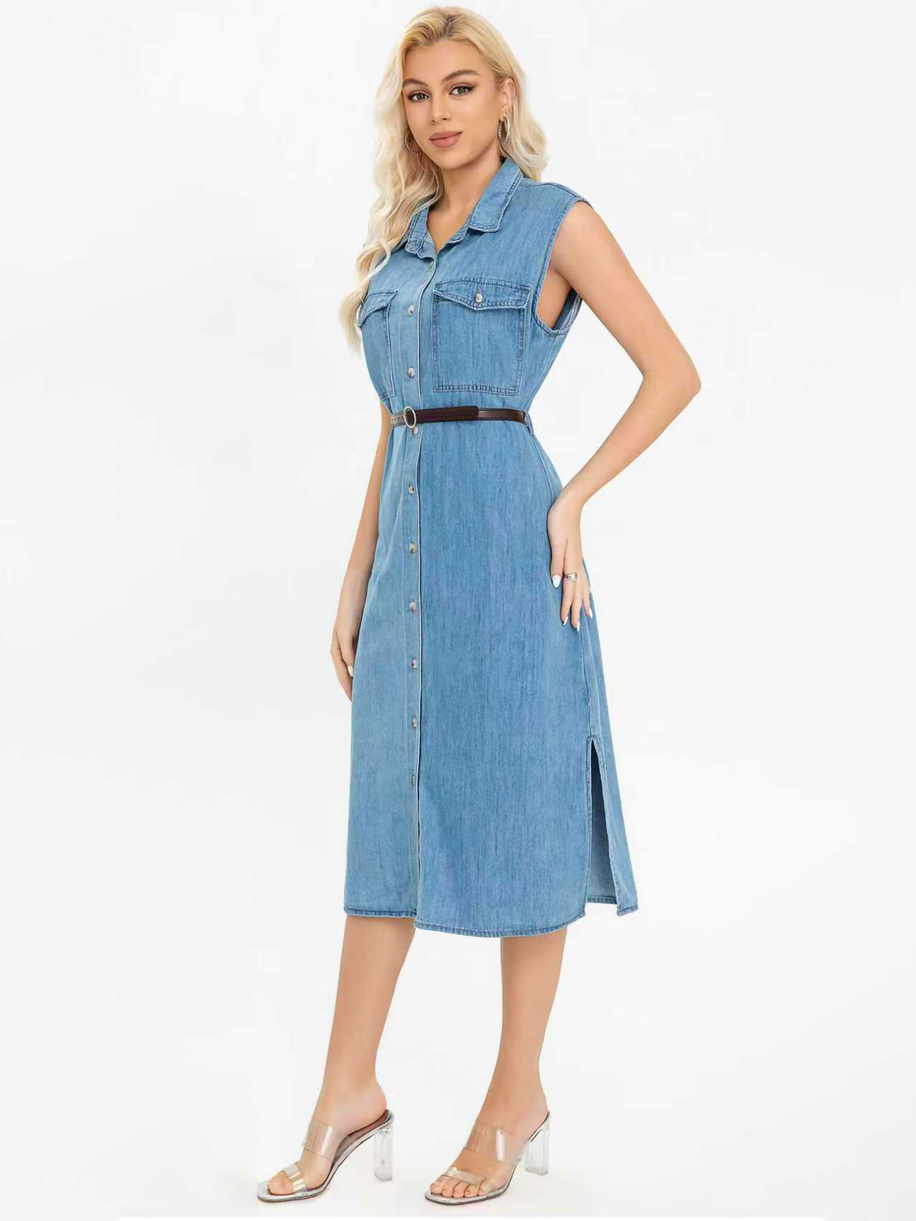 Denim midi dress with a side vent. Classic collar. Sleeveless design. Front flap pockets. Slim belt. Front button fastening.