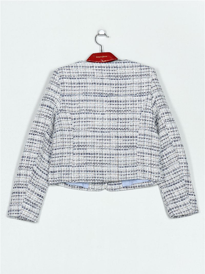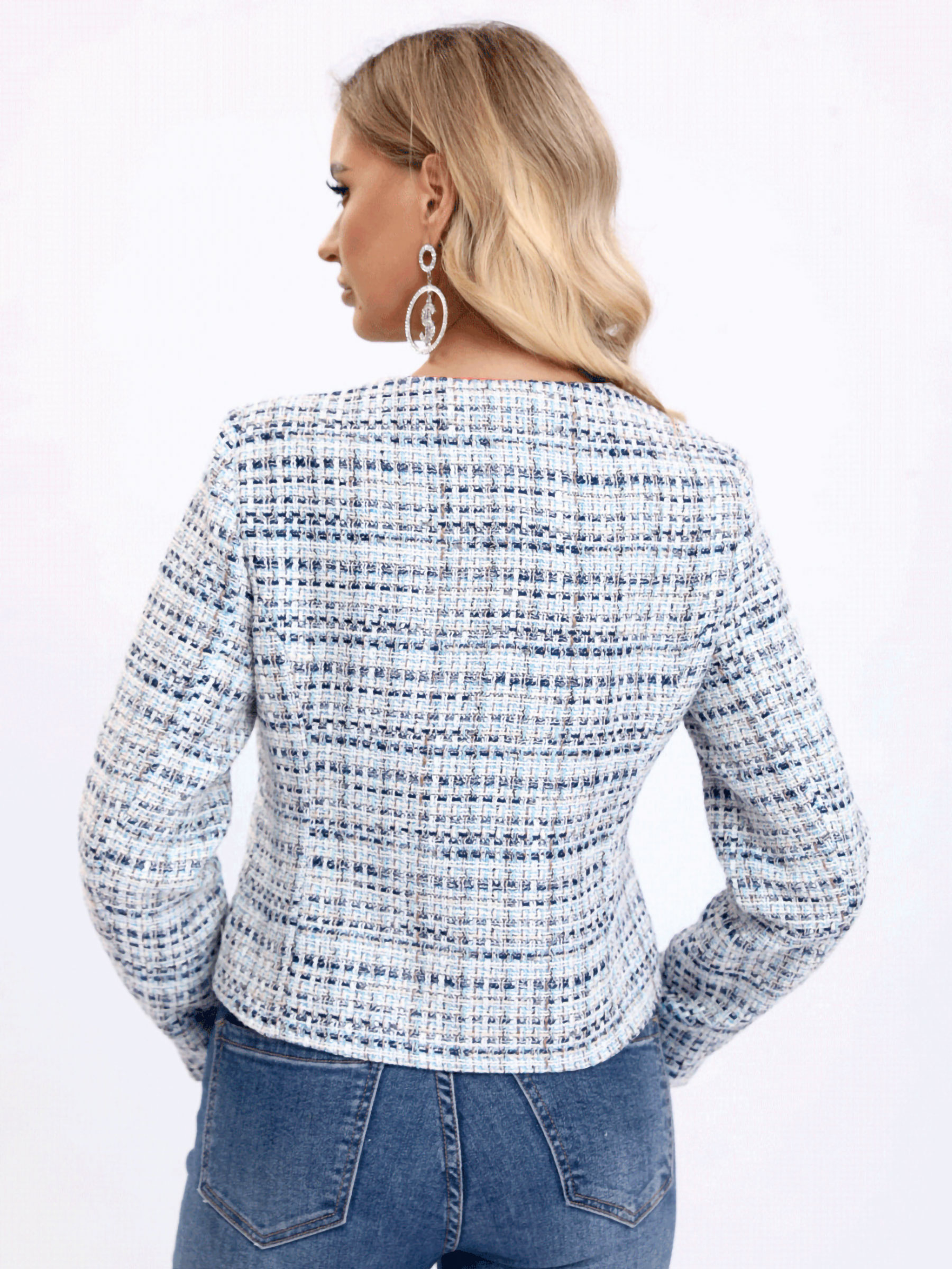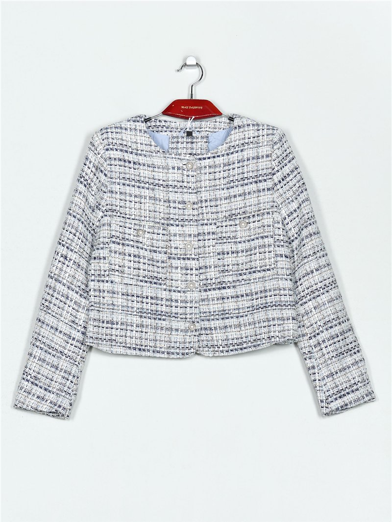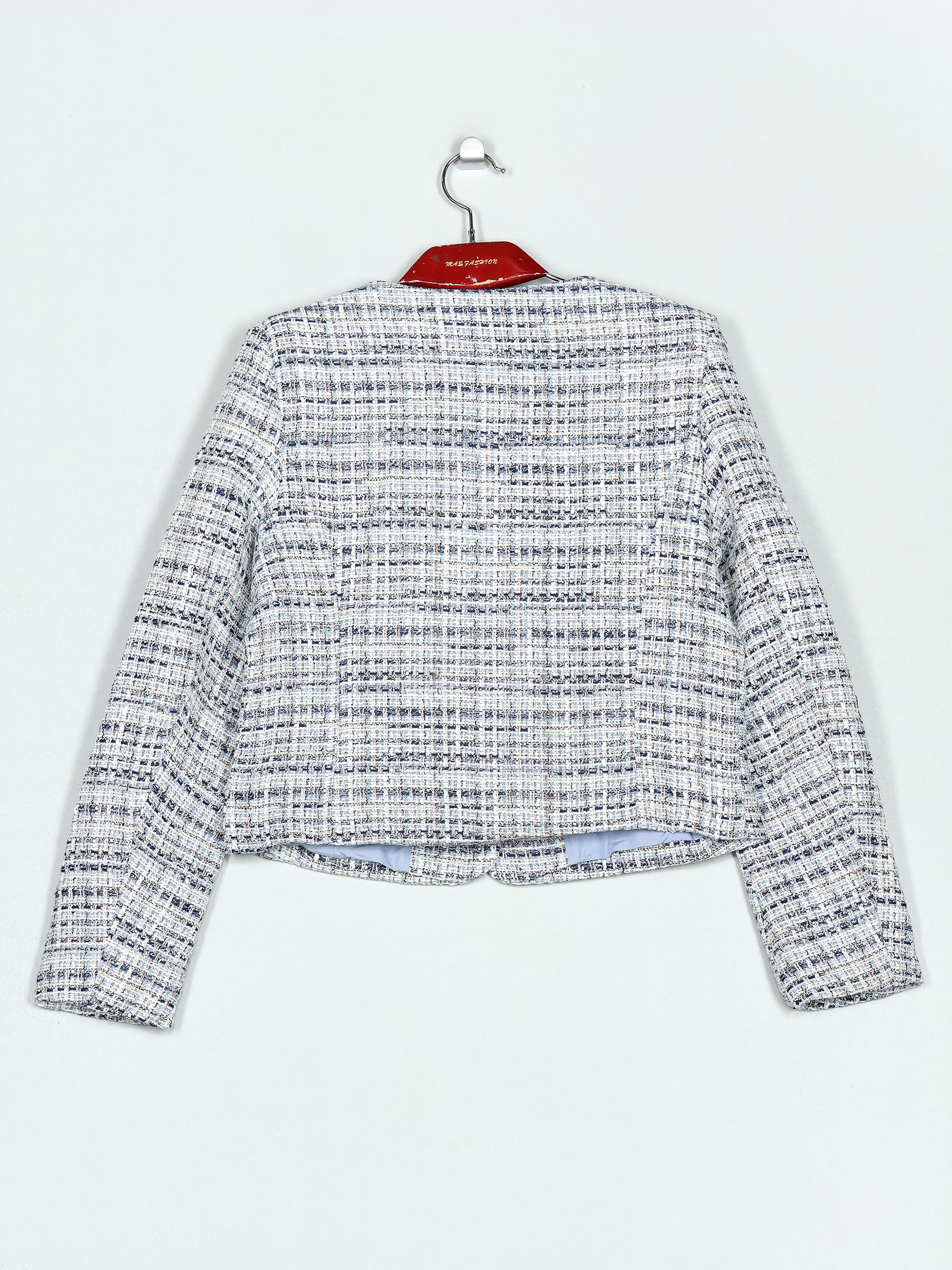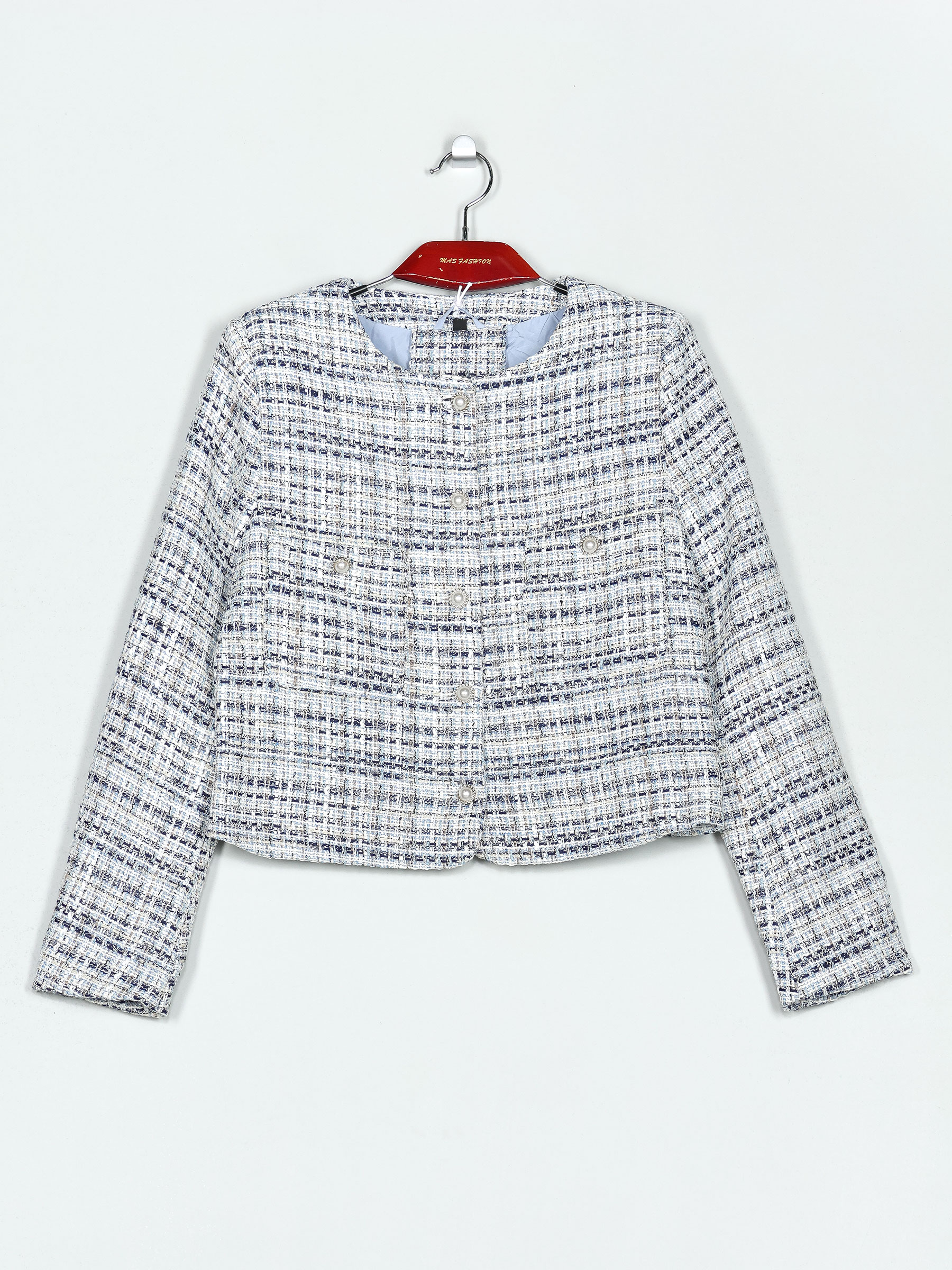 Round neck tweed jacket with long sleeves. Featuring chest patch pockets and button fastening in the front.