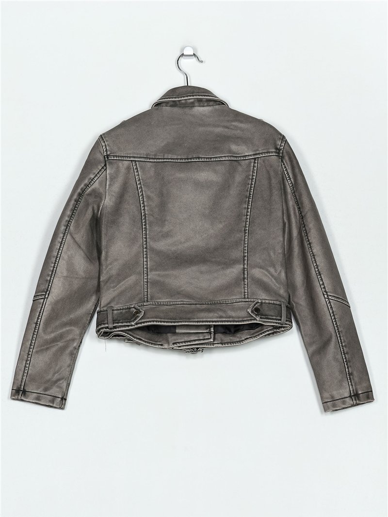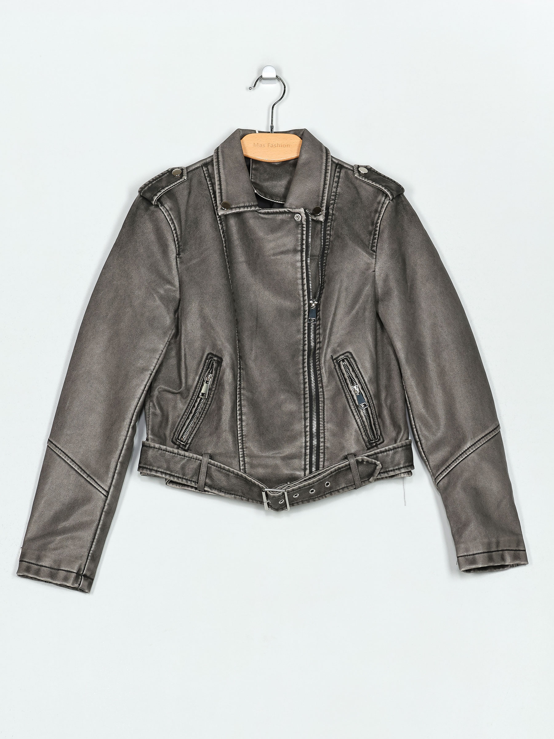 Belted faux leather jacket with a lapel collar. Featuring side zip pockets and a metal zip-up front.