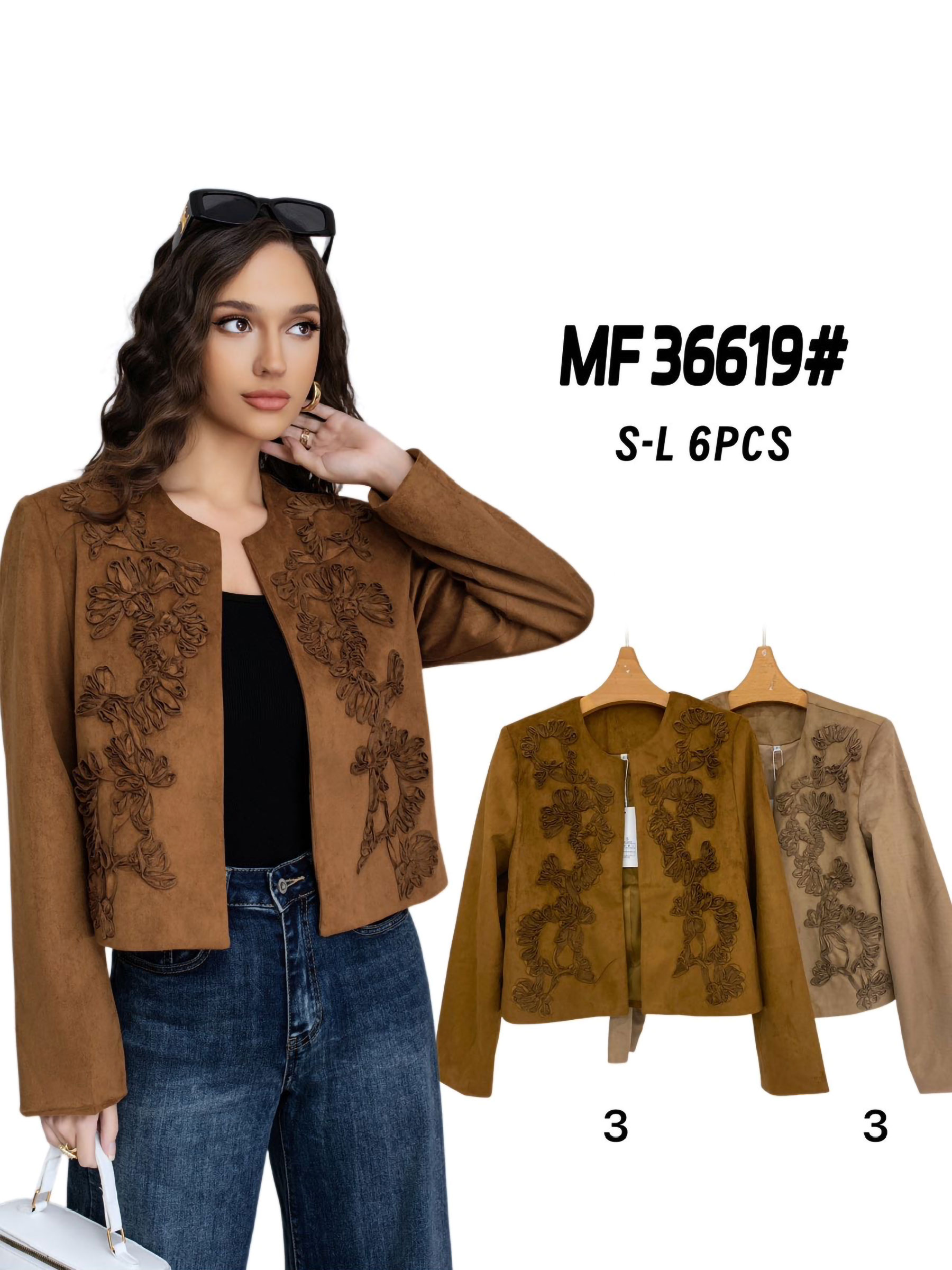 Embroidered faux suede jacket with a round neckline and long sleeves.