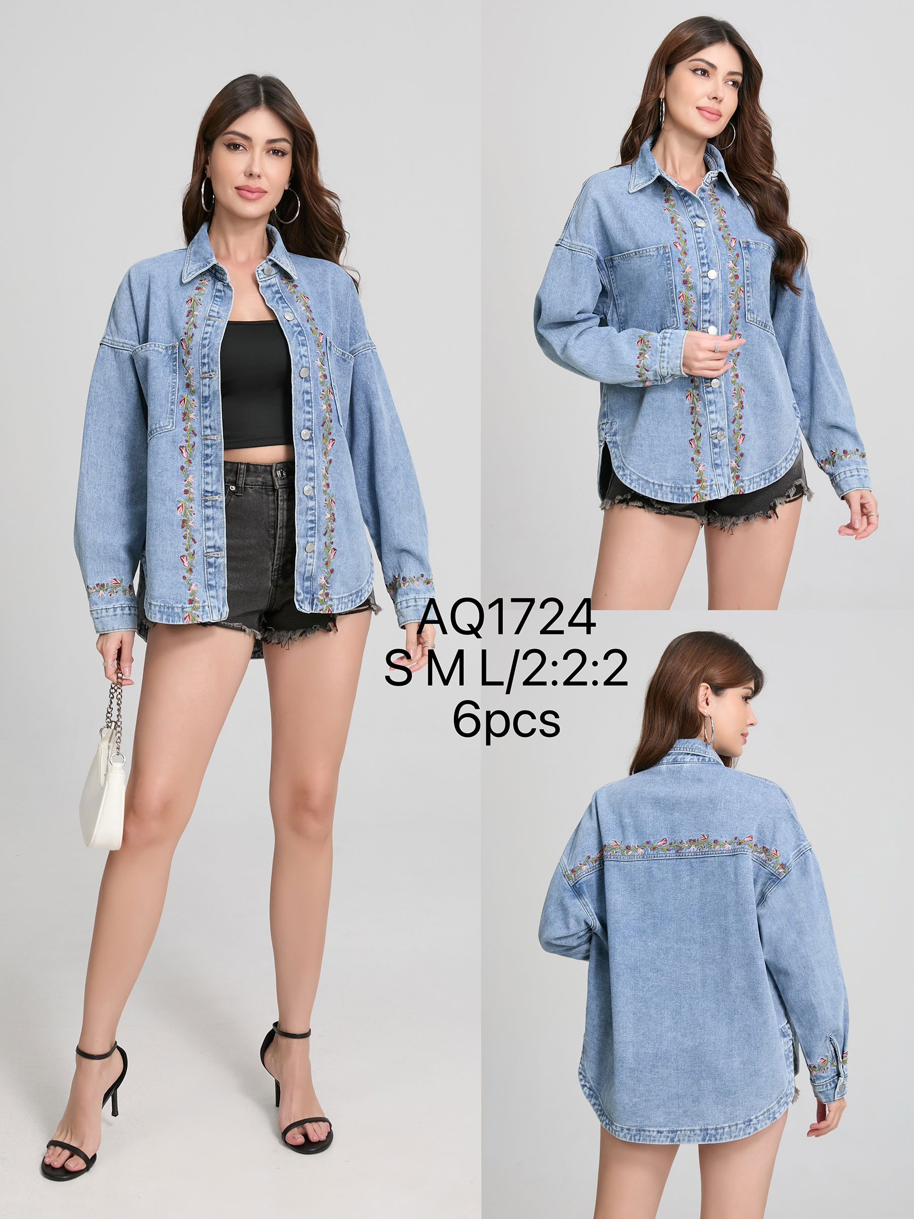 Denim overshirt. Multicolour embroidery. Classic collar. Long sleeves. Button cuffs. Curved hem. Button through front.