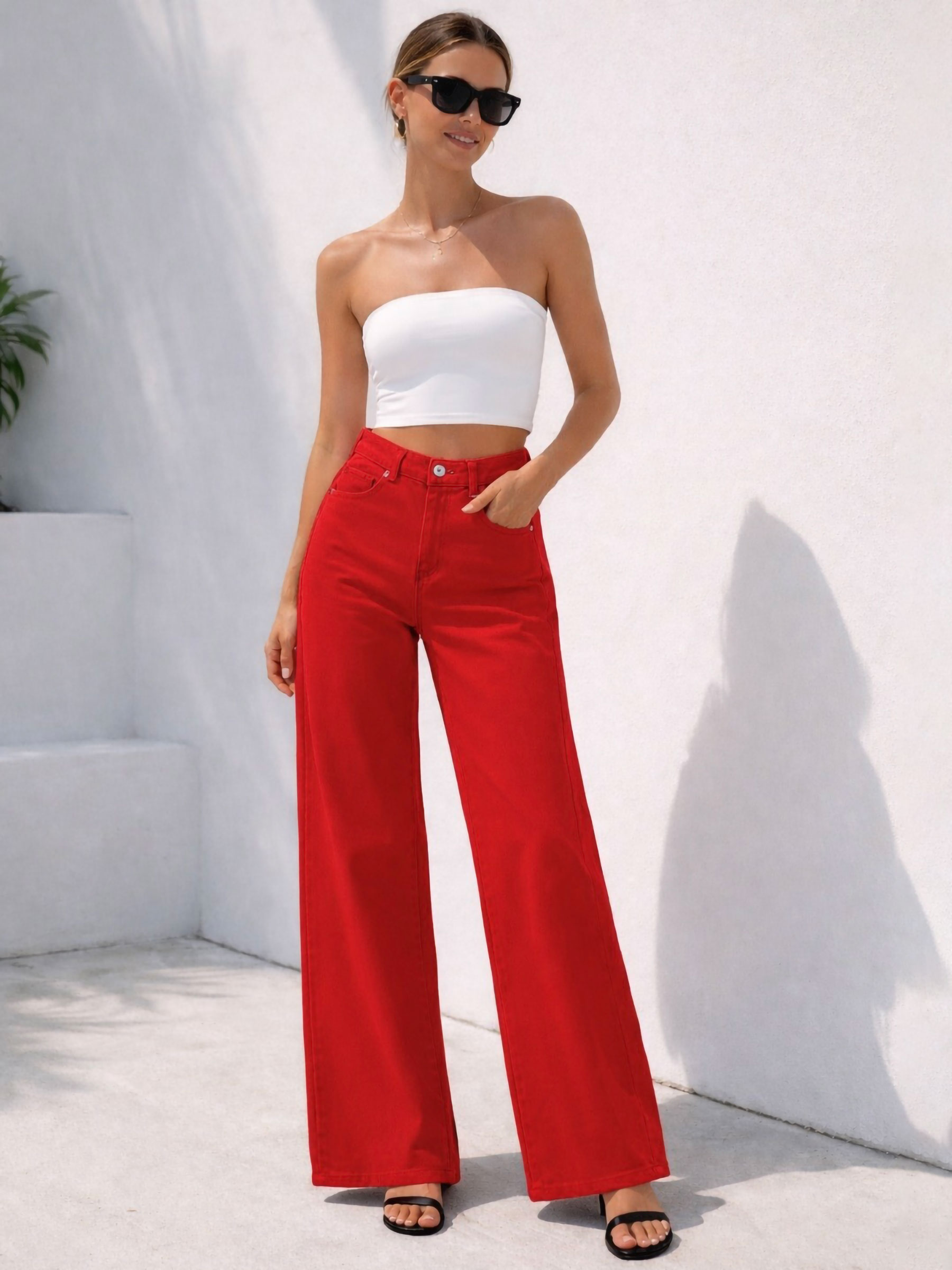 Wide leg jeans. Glitter star detail on back pockets. High waist. Five pockets. Front zip and metal button fastening. Rise 28 cm. Length 101 cm. Hem 23 cm.