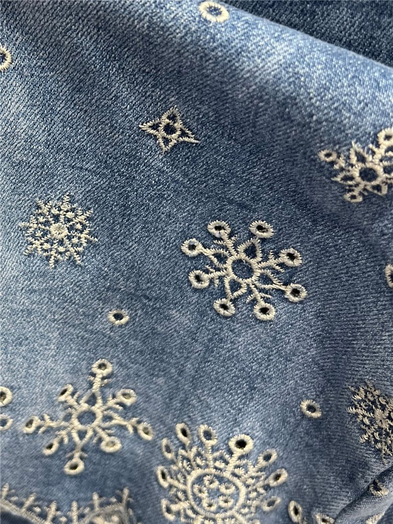 Straight jeans. Embroidered scallop hem detail. High waist. Five pockets. Front zip and metal button fastening. Rise 26 cm. Length 95 cm. Hem 25 cm.