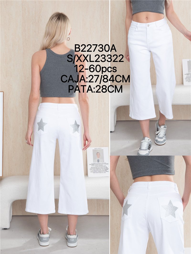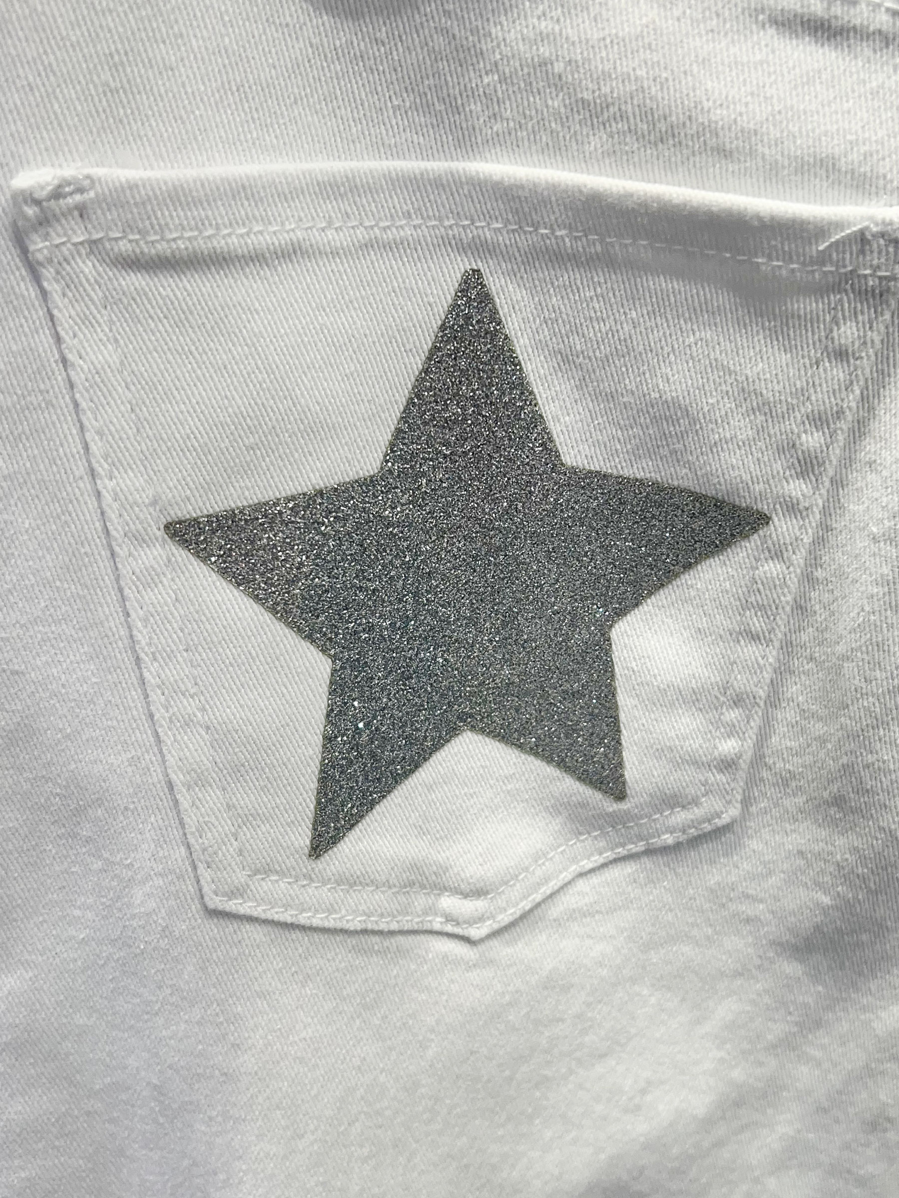 Culotte jeans. Glitter star detail on back pockets. High waist. Five pockets. Front zip and metal button fastening. Rise 27 cm. Length 84 cm. Hem 28 cm.
