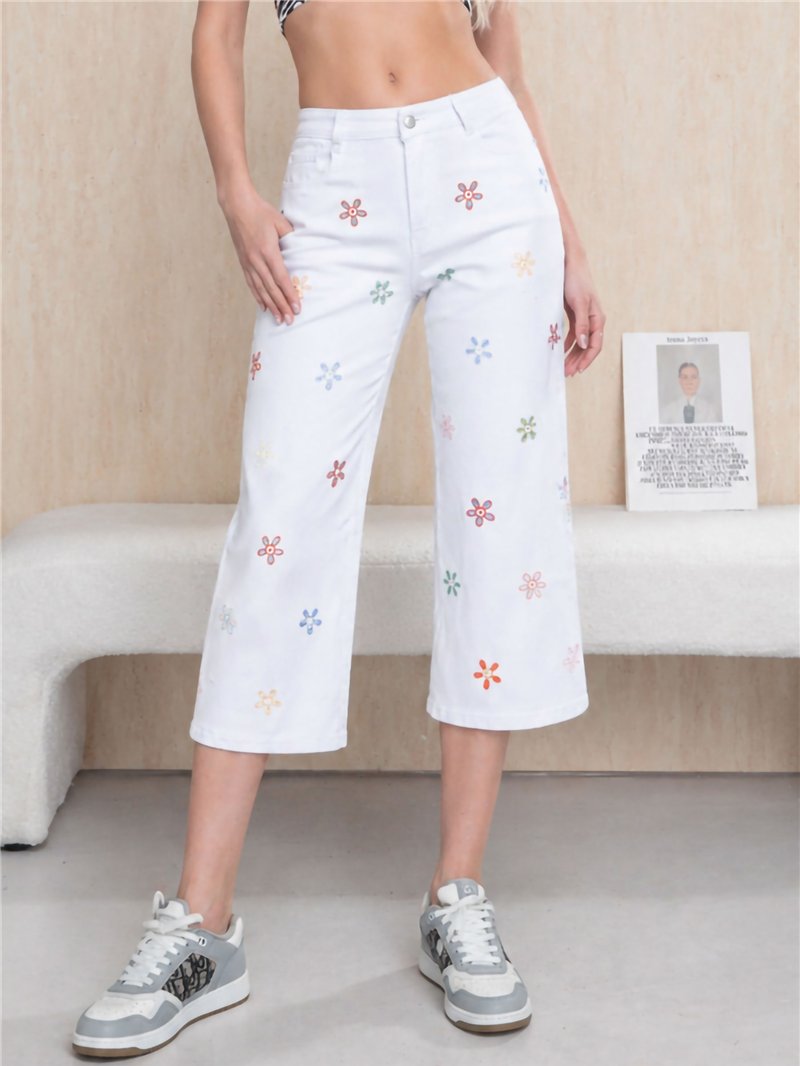 White culotte jeans. Multicolor embroidered flower detail. High waist. Five pockets. Straight hem. Front zip and metal button fastening. Rise 27 cm. Length 80 cm. Hem 26 cm.