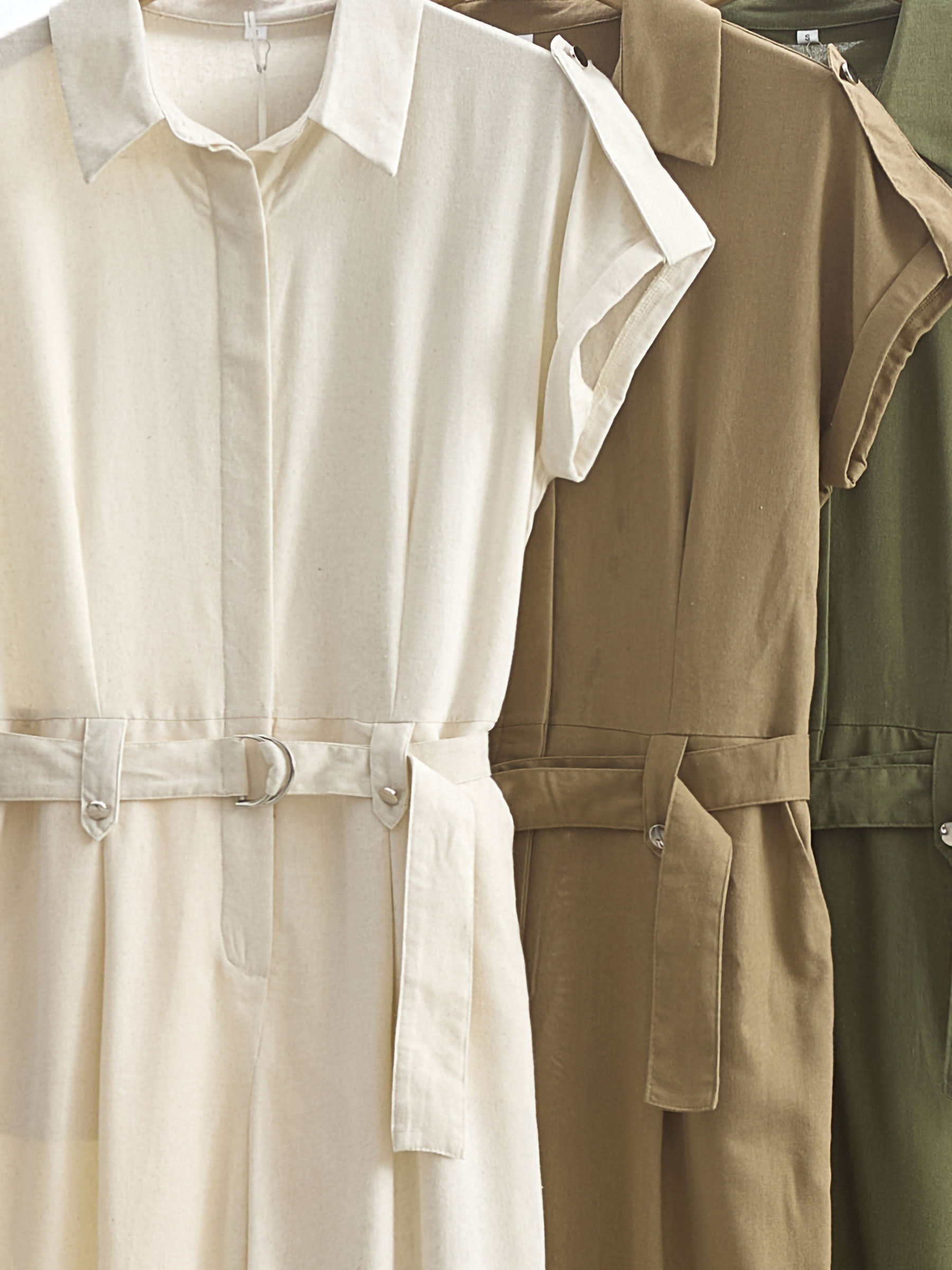 Linen jumpsuit. Shirt collar. Rolled short sleeves with tab. Concealed front closure. Buckle belt. Straight leg.
