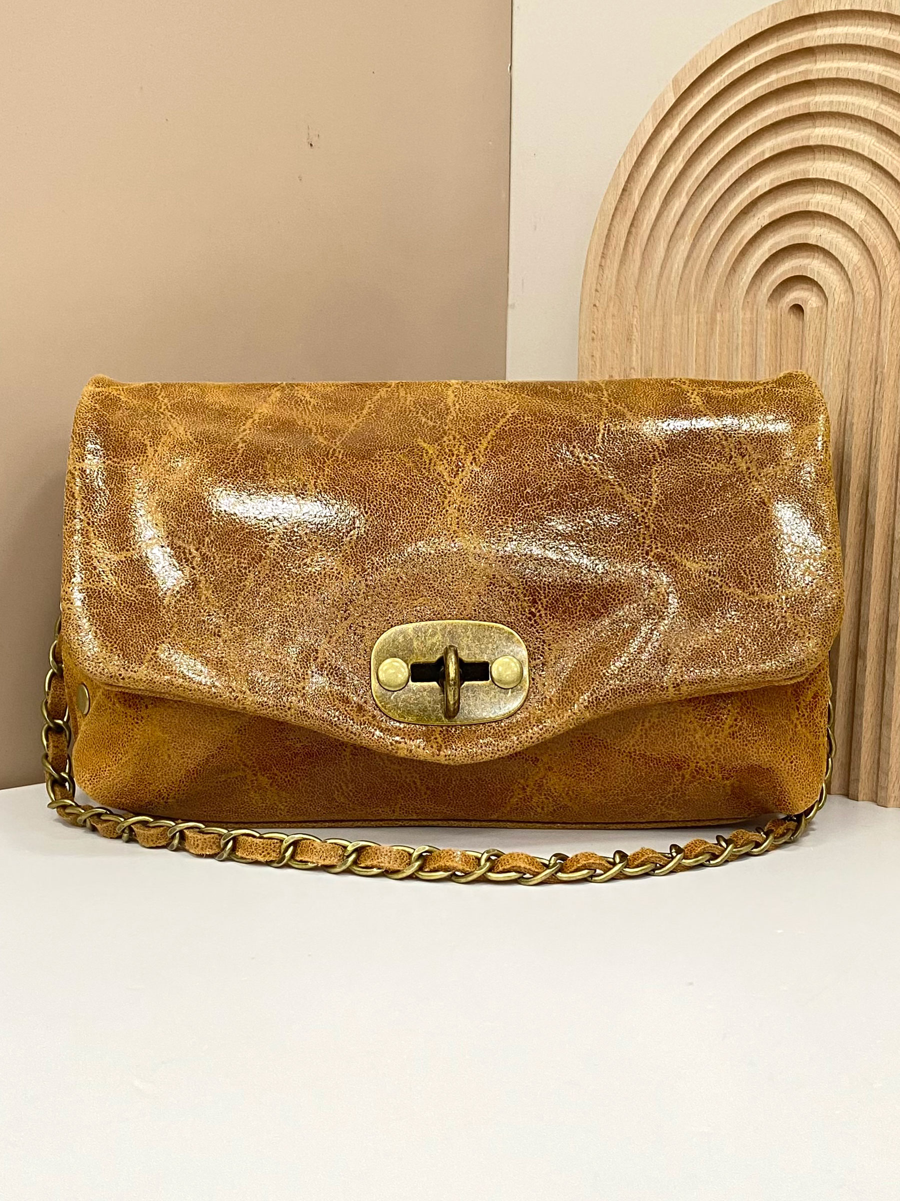 Leather mini clutch with flap camel