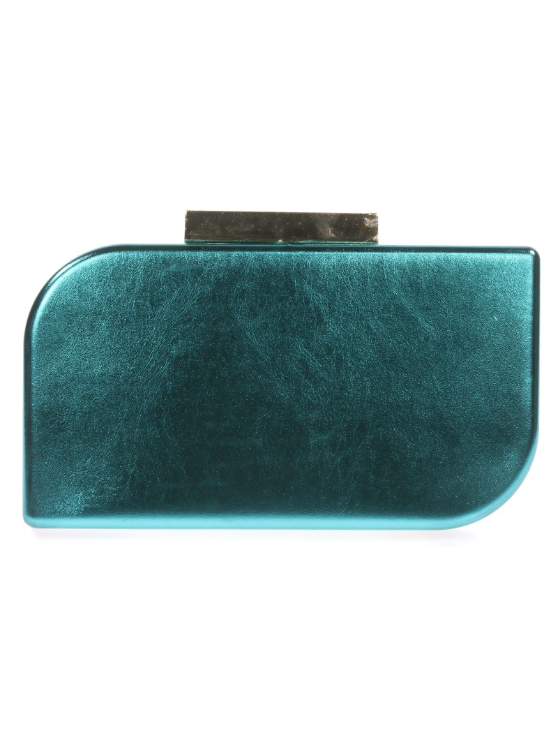 Clutch bag. Faux leather. Metallic exterior. Chain shoulder strap. Lined interior. Gold metal clasp closure.