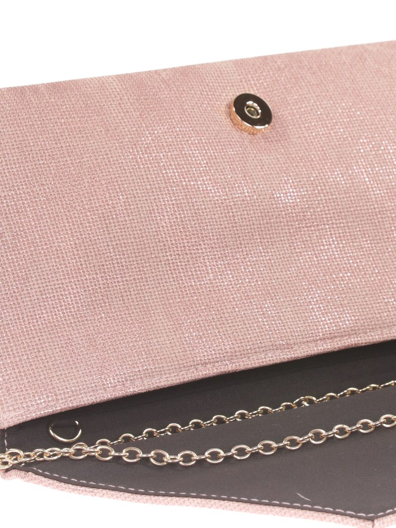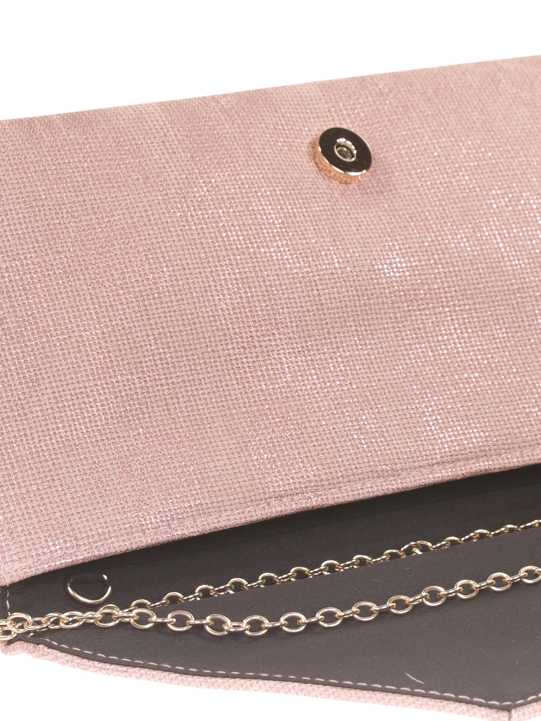 Clutch bag. Faux leather. Metallic exterior. Chain shoulder strap. Lined interior with zip pocket. Magnetic clasp closure.
