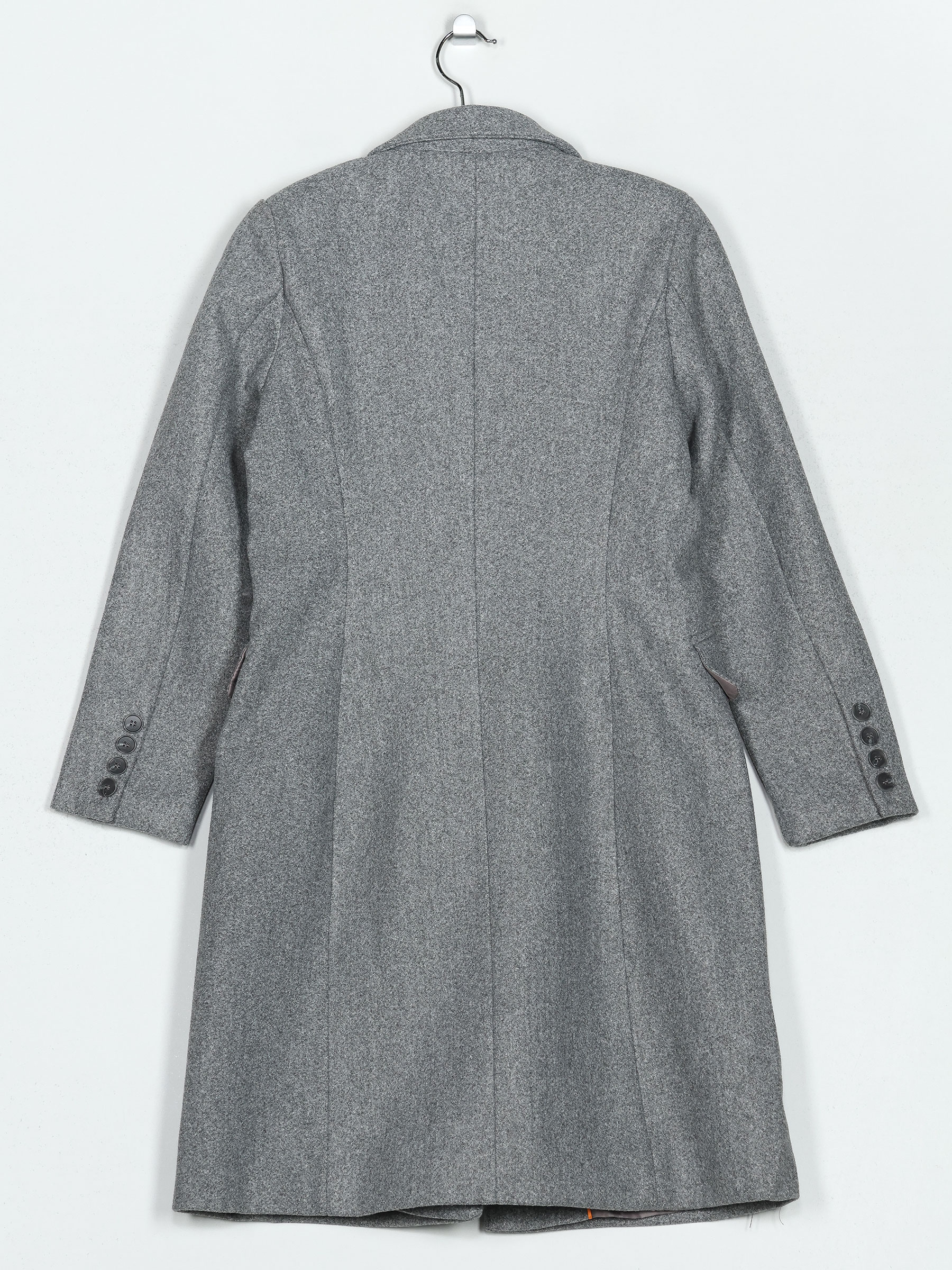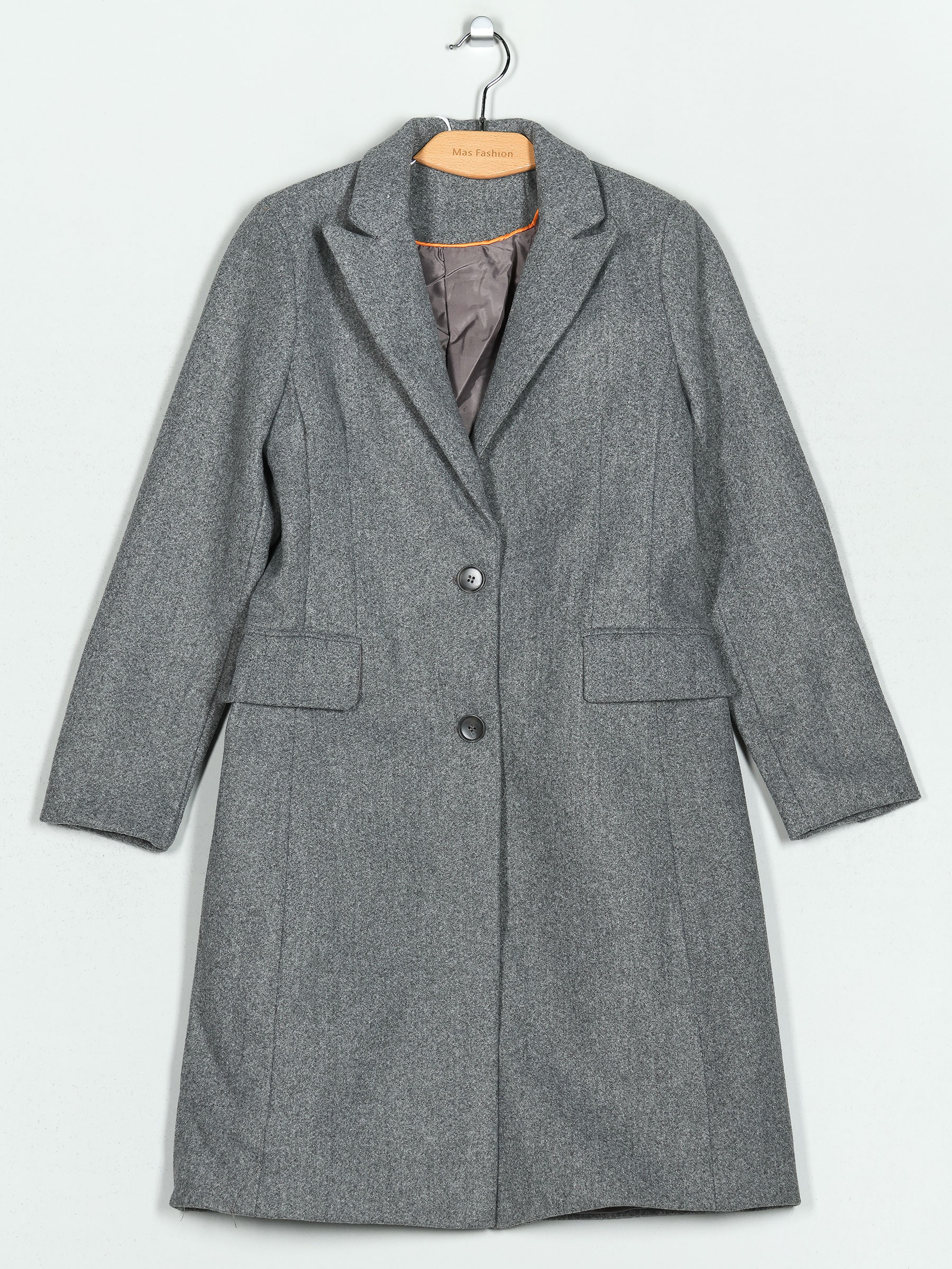 Lapel collar coat with long sleeves. Featuring front welt pockets with flap and button fastening in the front.