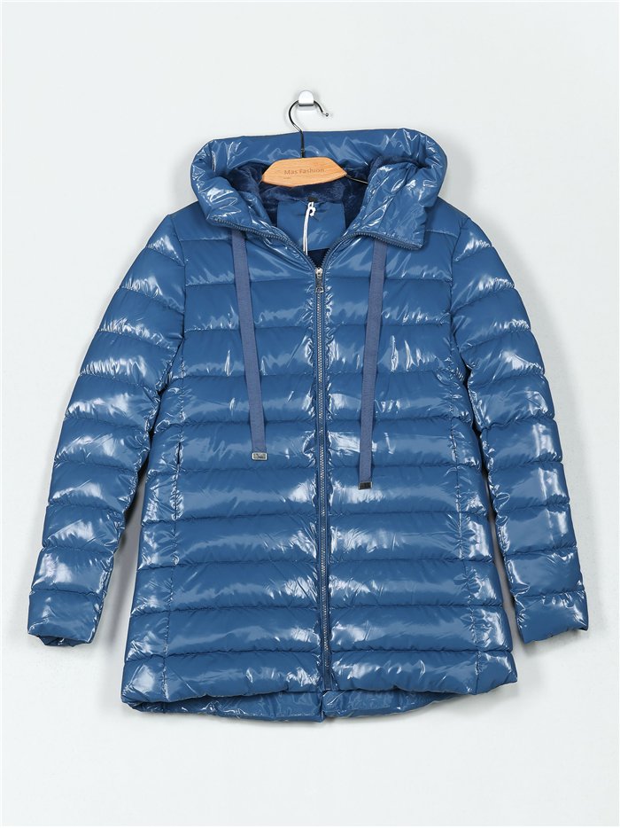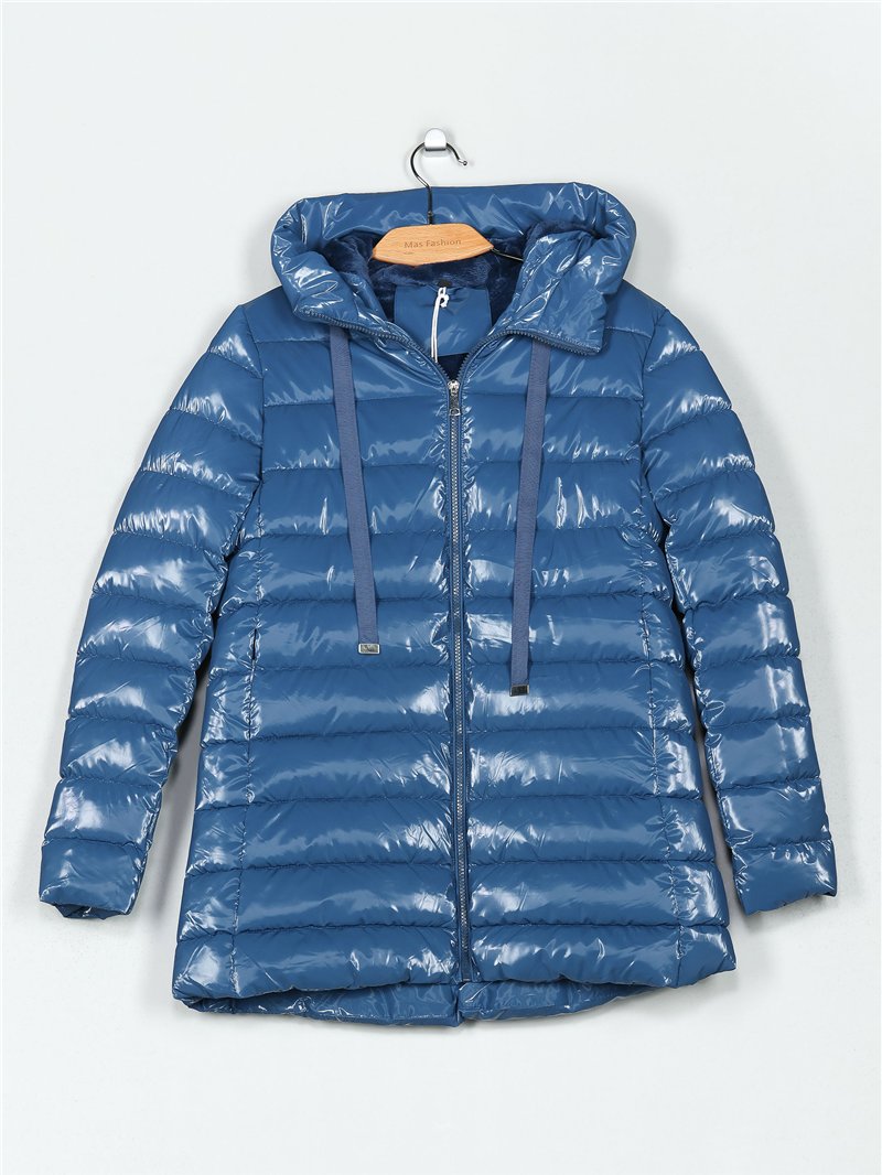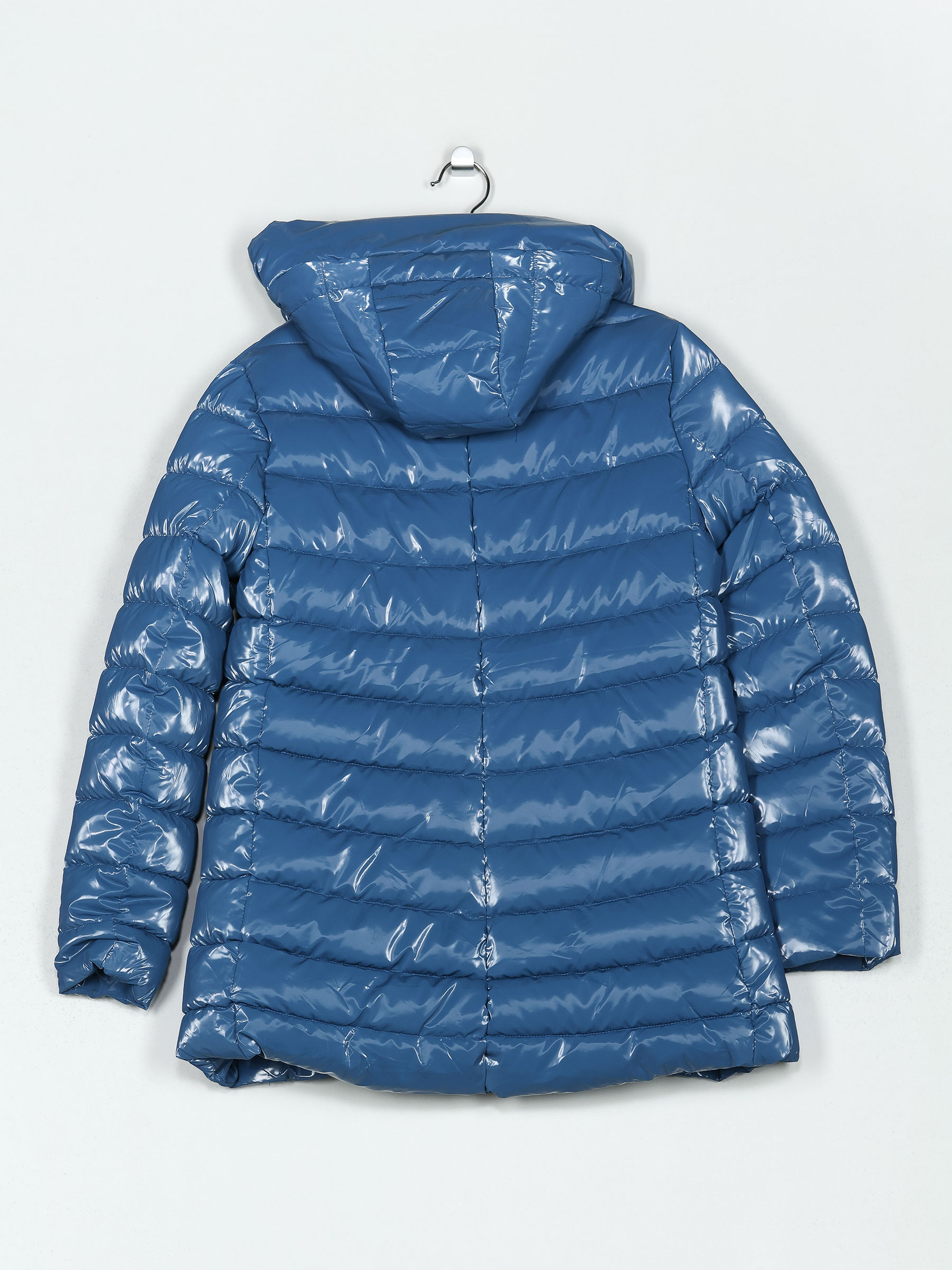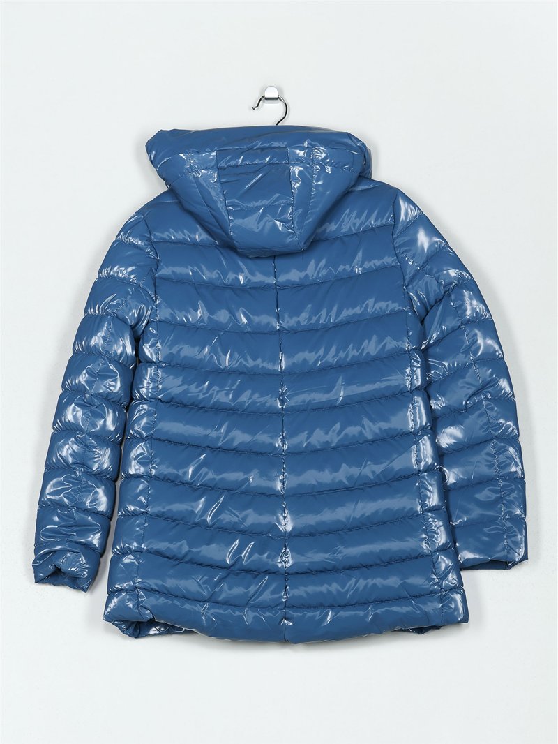 Patent finish anorak with a high collar and non-detachable hood. Water repellent. Long sleeves, featuring a matching faux fur interior, side zip pockets and metal zip fastening.
