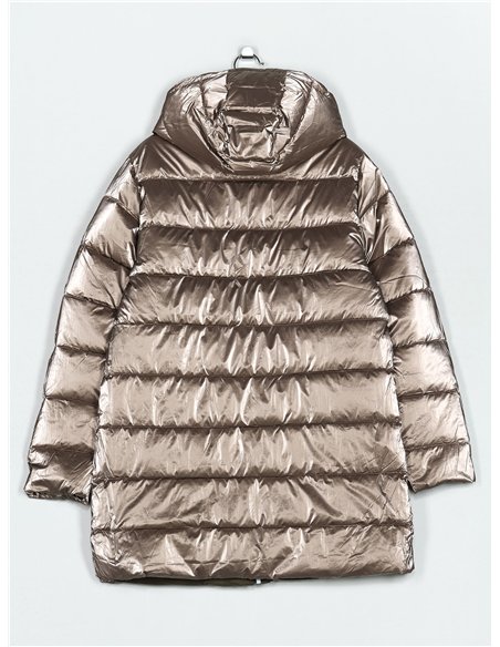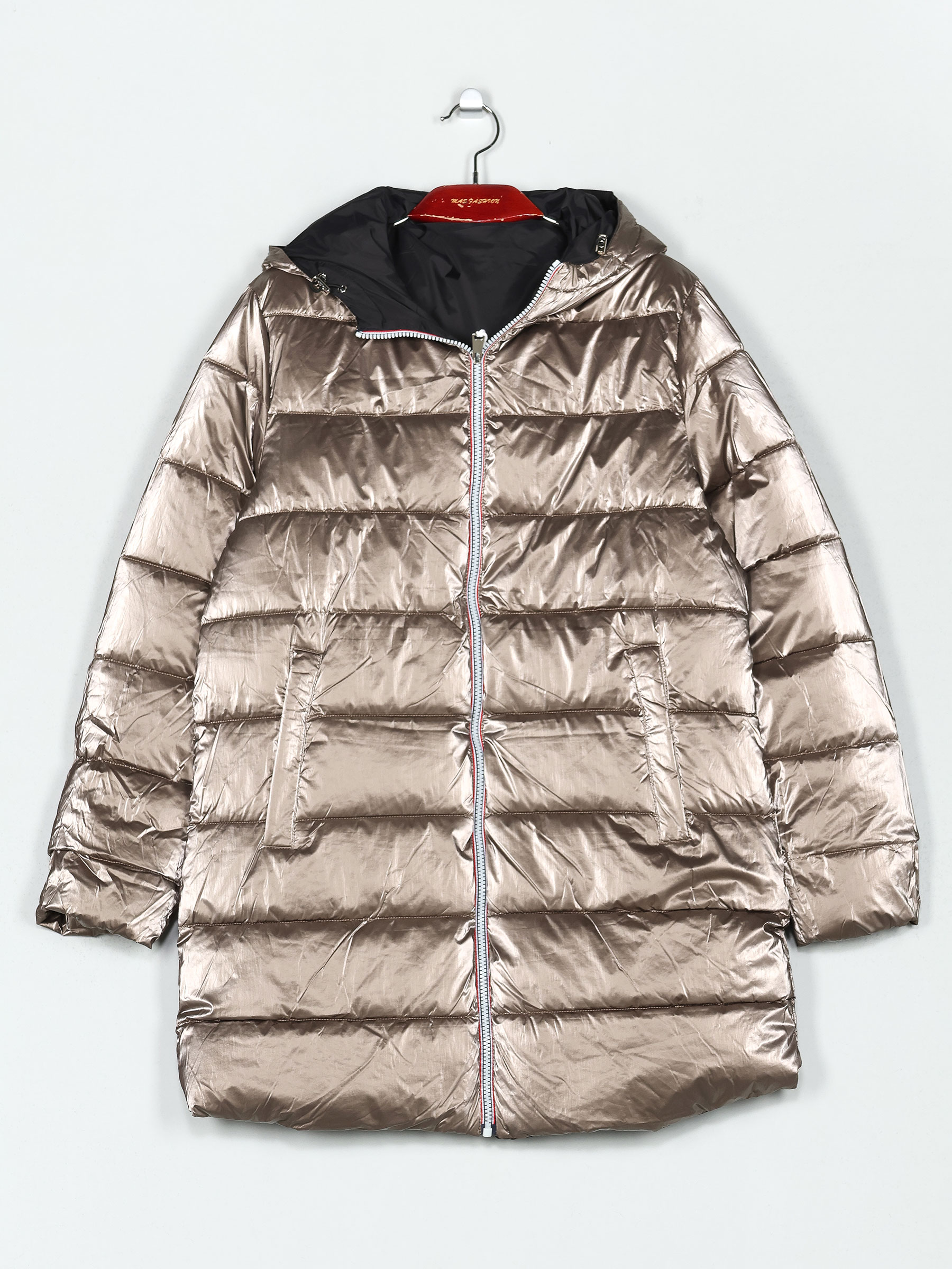 Oversized metallic thread anorak with a high collar and non-detachable hood. Featuring side pockets and metal zip fastening in the front.