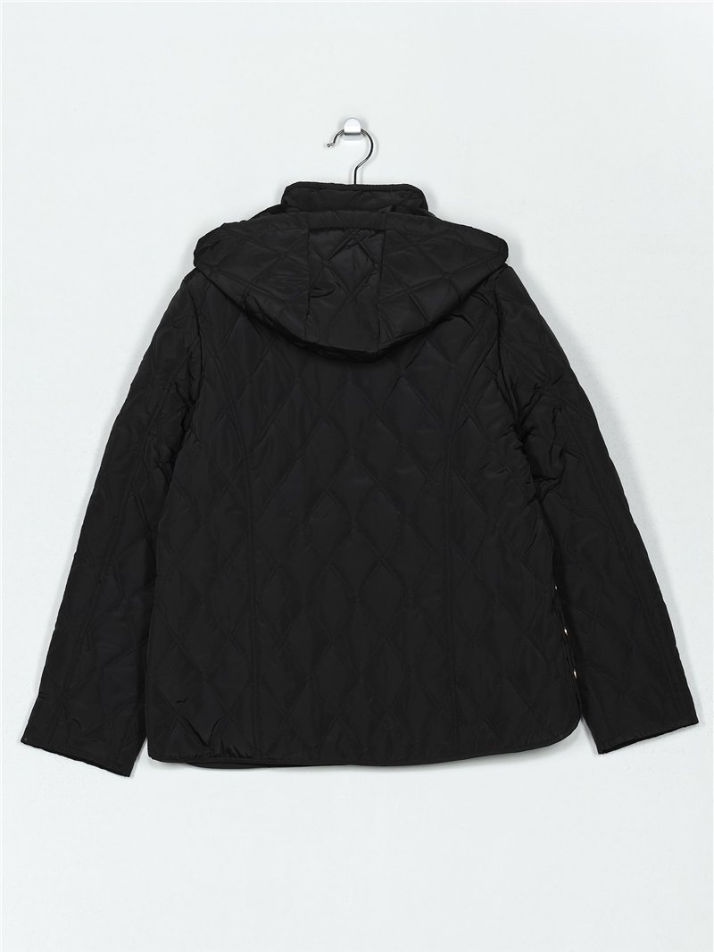 Quilted down puffer coat with a high collar and detachable hood. Long sleeves, featuring a side vent, side pockets and metal zip and snap button fastening in the front.