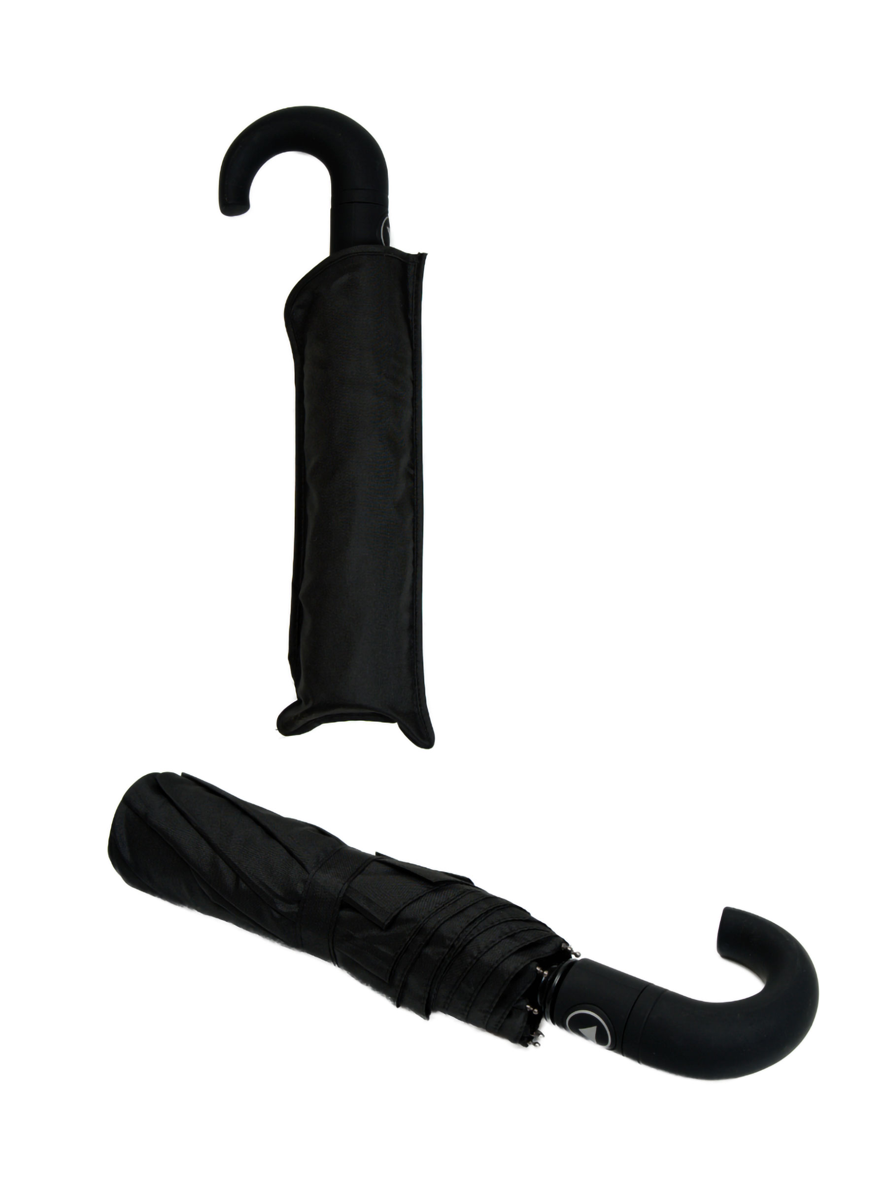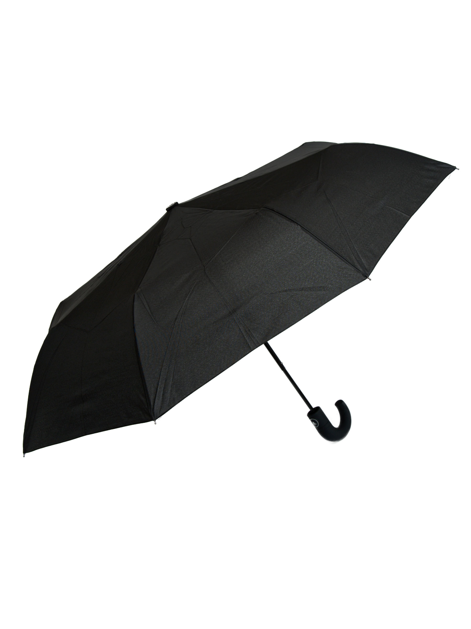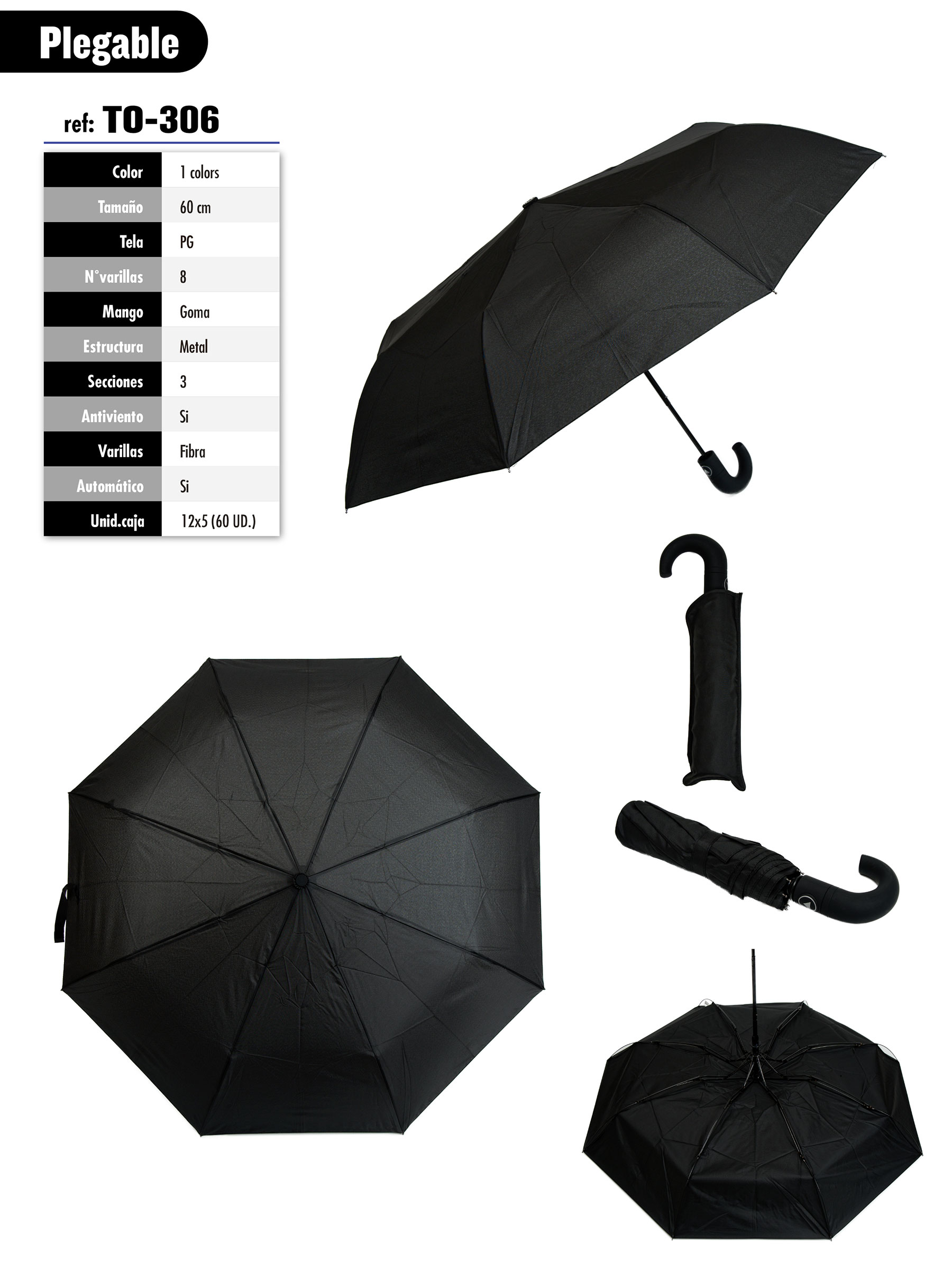 Black folding umbrella. PG fabric. Windproof. Automatic. 8 fiberglass ribs. Rubber handle. Metal frame. Three-fold sections. Assorted colors.