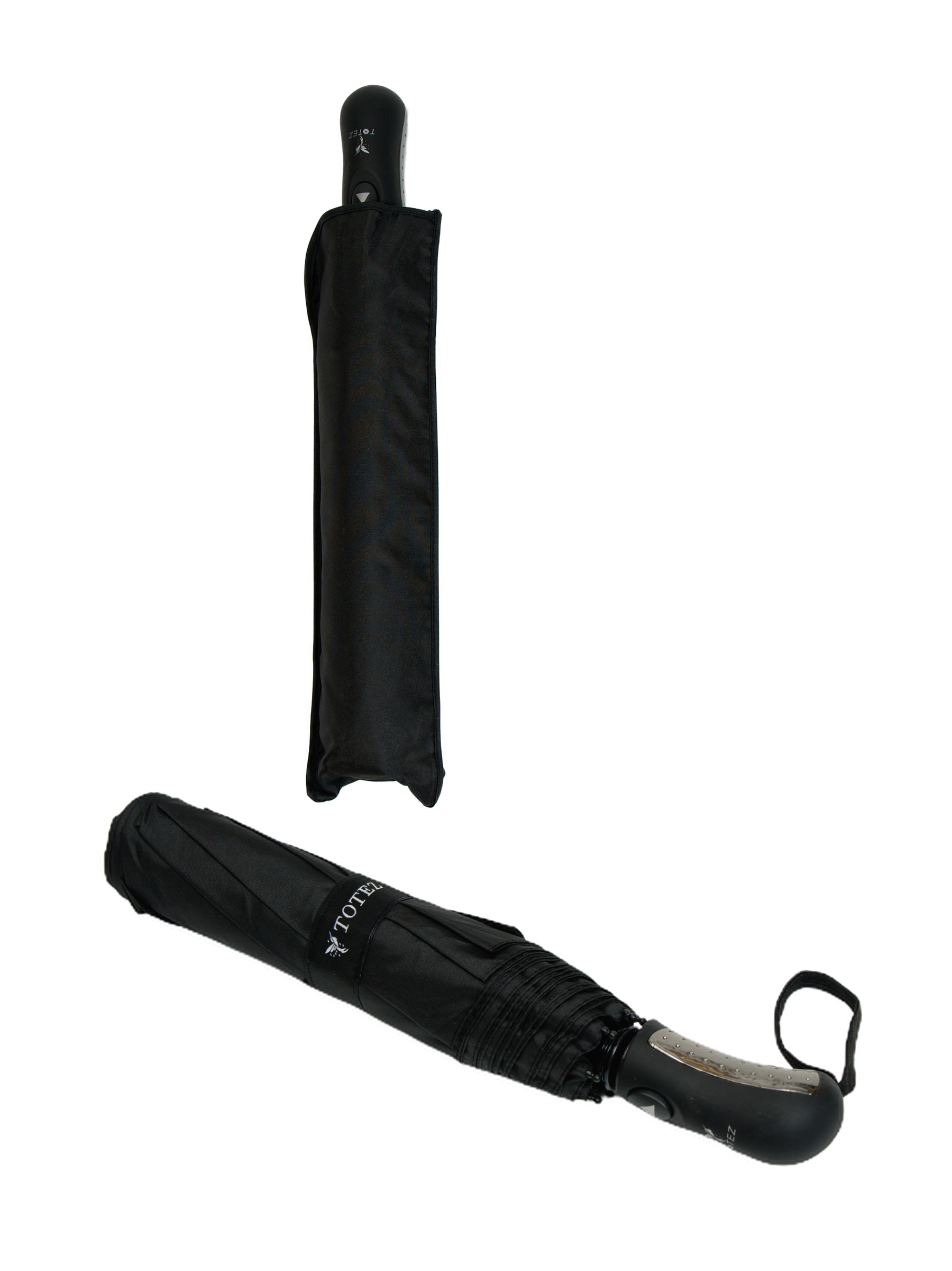 Black folding umbrella. PG fabric. Windproof. Automatic. 8 fiberglass ribs. Rubber handle. Metal frame. Three-fold sections. Assorted colors.