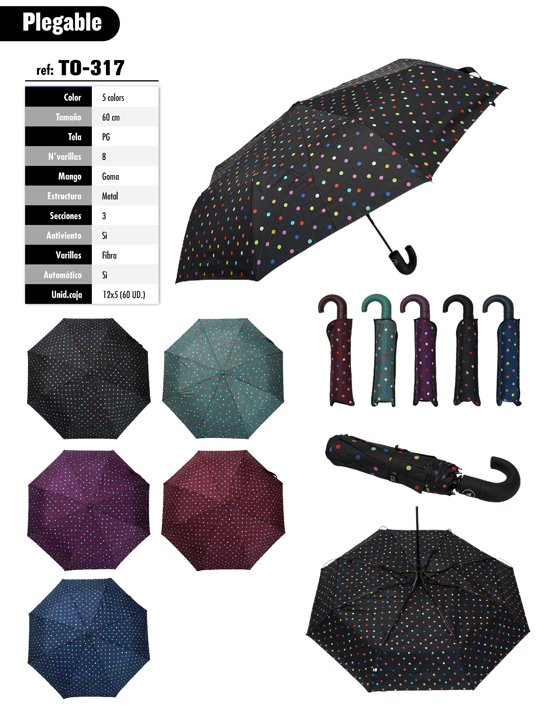 Polka dot folding umbrella. PG fabric. Windproof. Automatic. 8 fiberglass ribs. Rubber handle. Metal frame. Three-fold sections. Assorted colors.