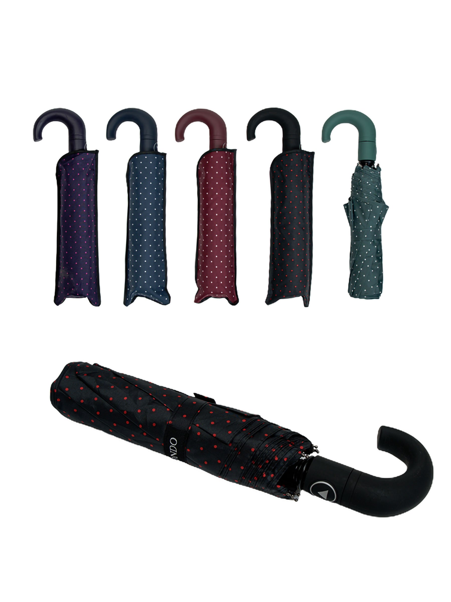 Polka dot folding umbrella. PG fabric. Windproof. Automatic. 8 fiberglass ribs. Rubber handle. Metal frame. Three-fold sections. Assorted colors.