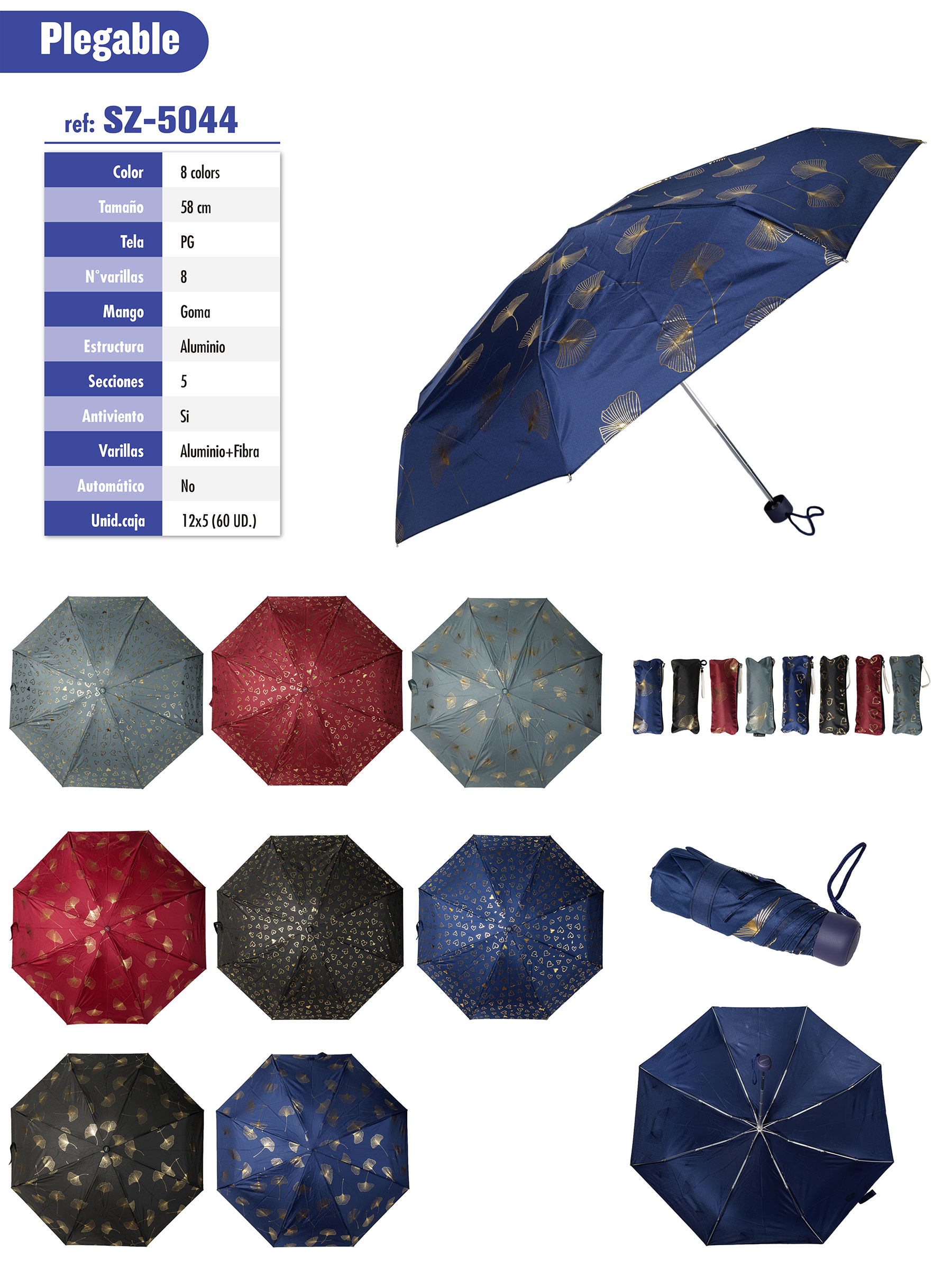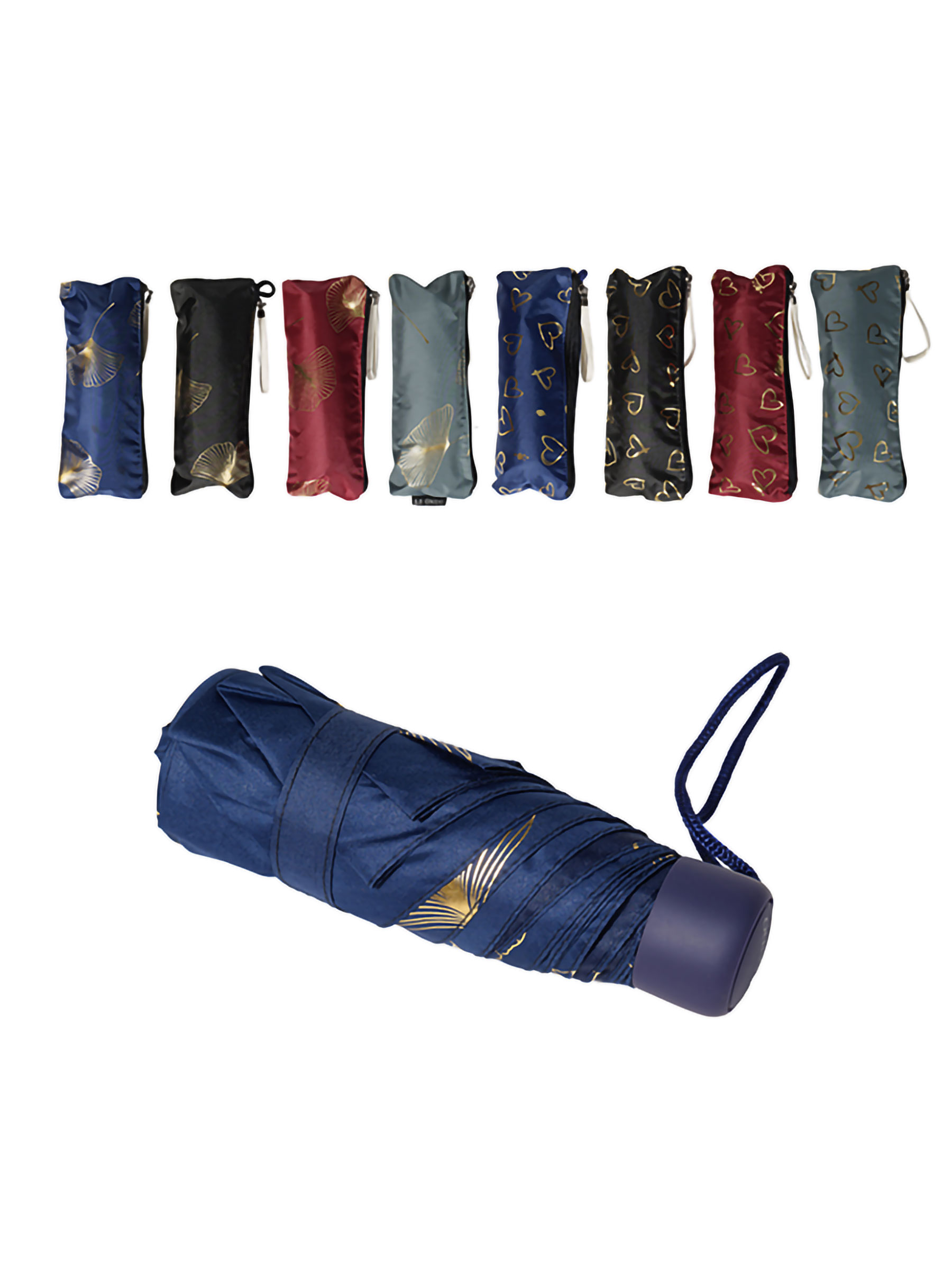 Shiny fabric printed folding mini umbrella. PG fabric. Windproof. Non-automatic. 8 aluminum and fiberglass ribs. Rubber handle. Aluminum frame. Five-fold sections. Assorted colors.