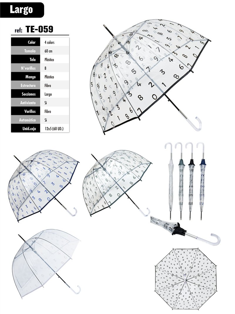 Long transparent umbrella, 60 cm with numbers print, 8 fiberglass ribs, automatic open and wind resistant. Plastic hook handle.