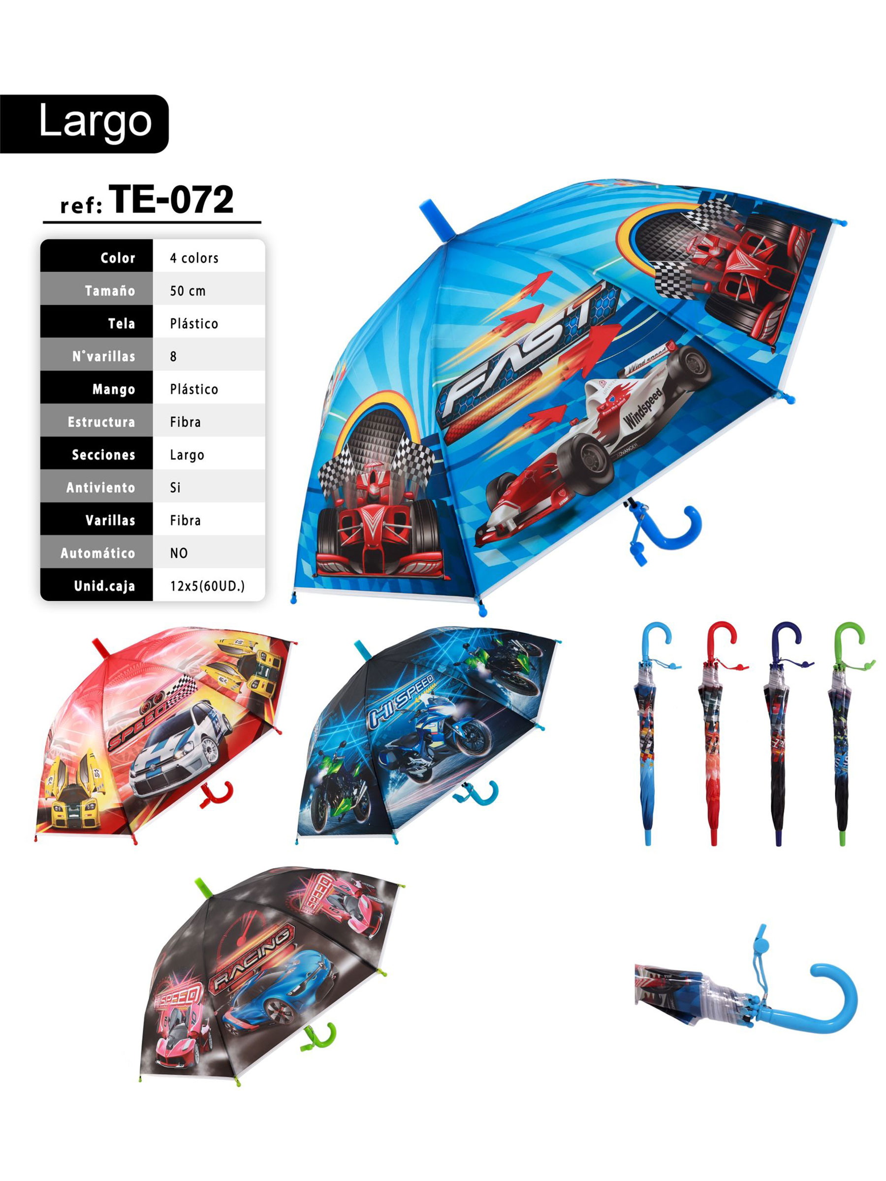 Kids plastic long umbrella with 8 fiberglass ribs. Racing cars and motorbikes artwork. Wind resistant with plastic handle.