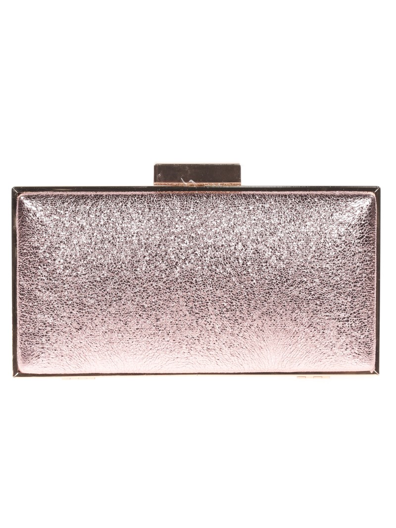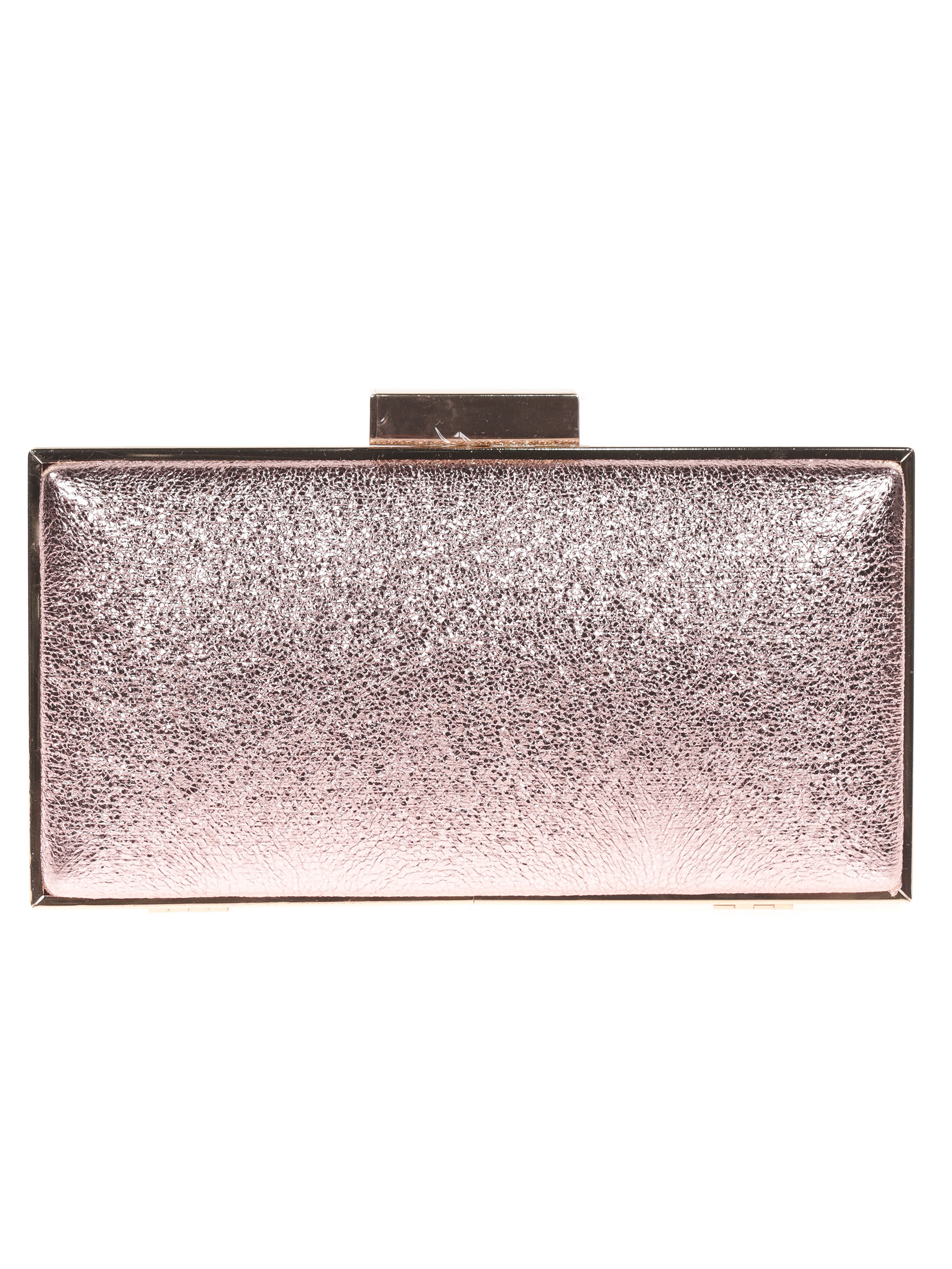 Clutch bag. Faux leather. Metallic exterior. Chain shoulder strap. Lined interior. Gold metal clasp closure.