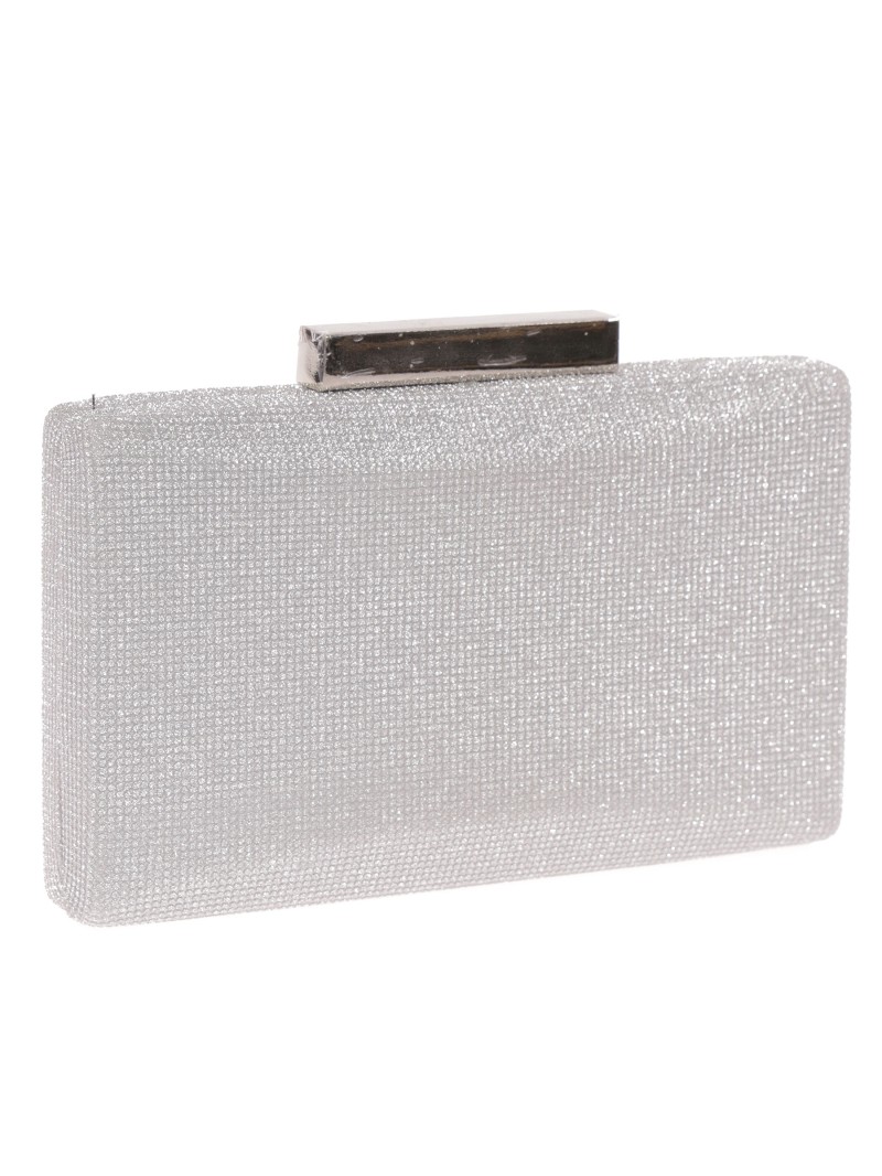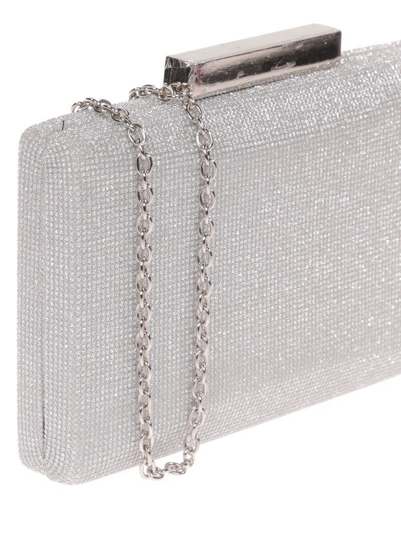 Clutch bag. Satin fabric. Metallic exterior. Chain shoulder strap. Lined interior. Silver metal clasp closure.