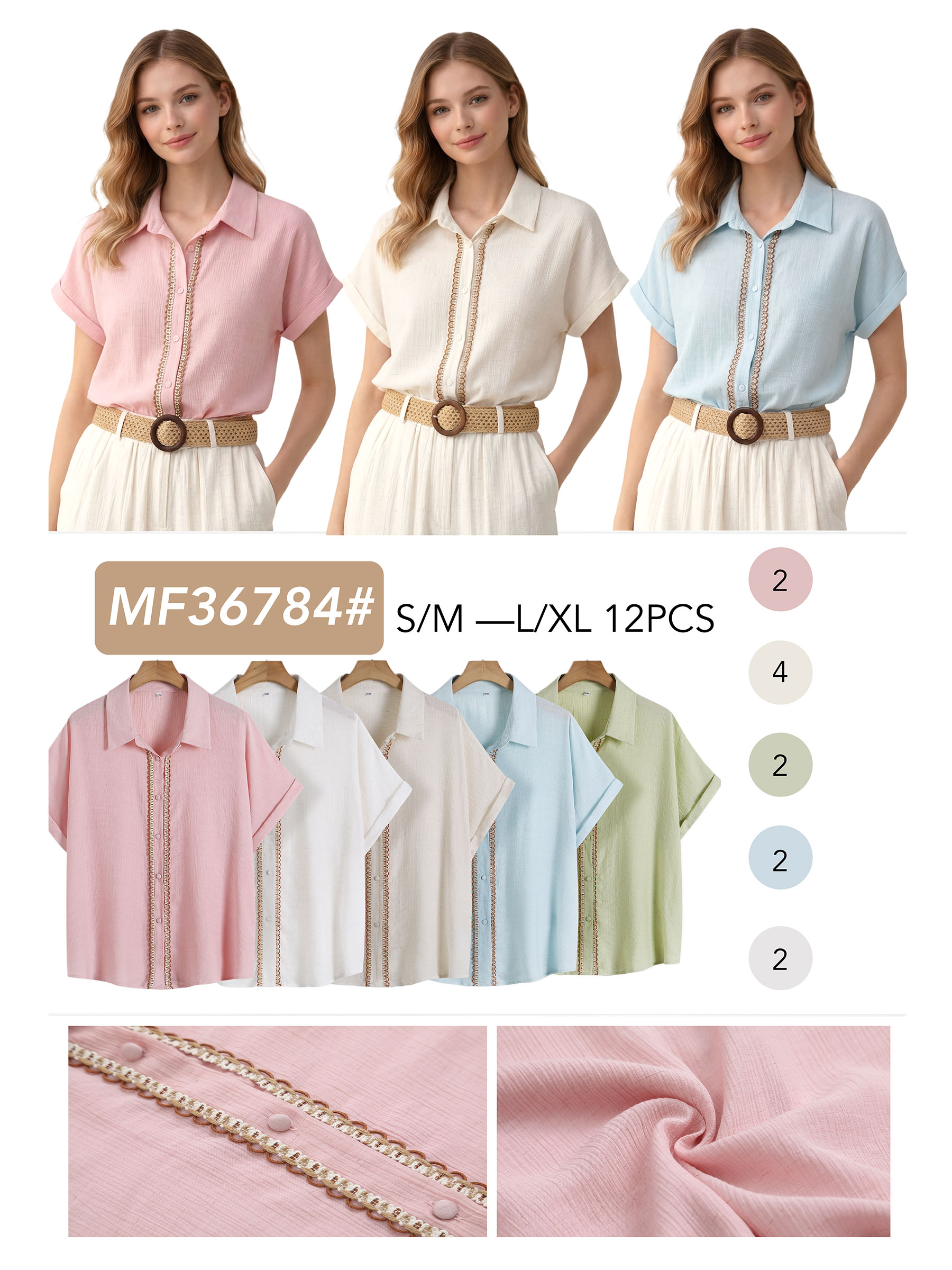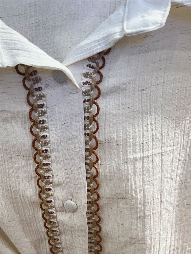 Short sleeve shirt. Classic collar. Relaxed sleeves. Decorative trim at the front. Button front. Crinkle finish fabric.