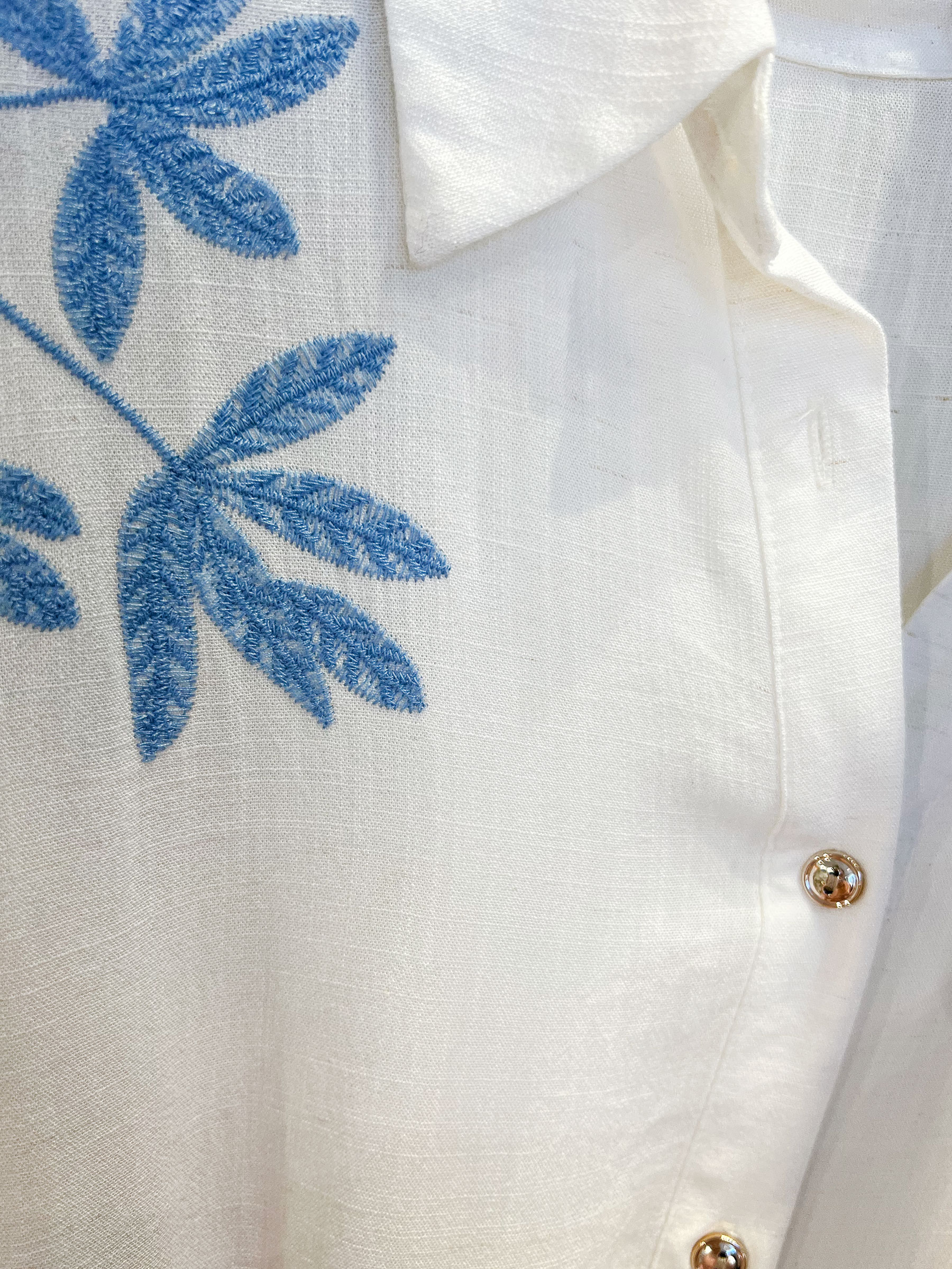 Embroidered leaf shirt. Collar neck. Short sleeves. Button front. Adjustable drawstring waist.