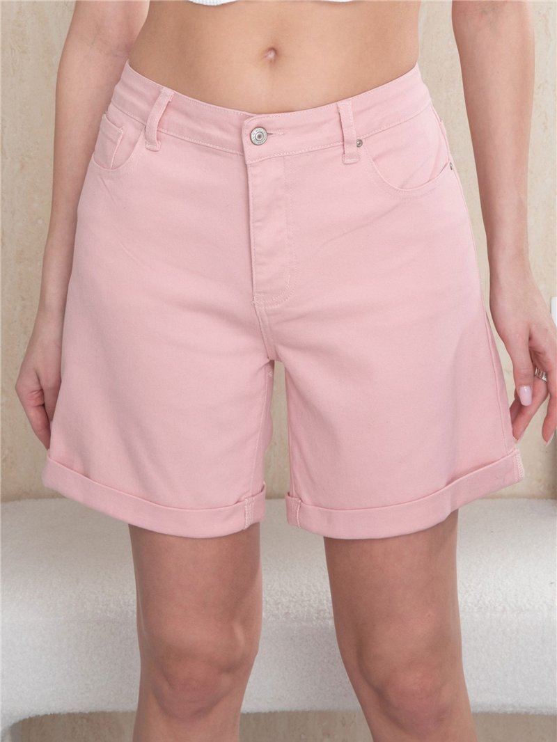 Plus size denim bermuda shorts. Glitter star detail on back pockets. High waist. Five pockets. Rolled hem. Front zip and metal button fastening. Rise 28 cm. Length 42 cm. Hem 28 cm.