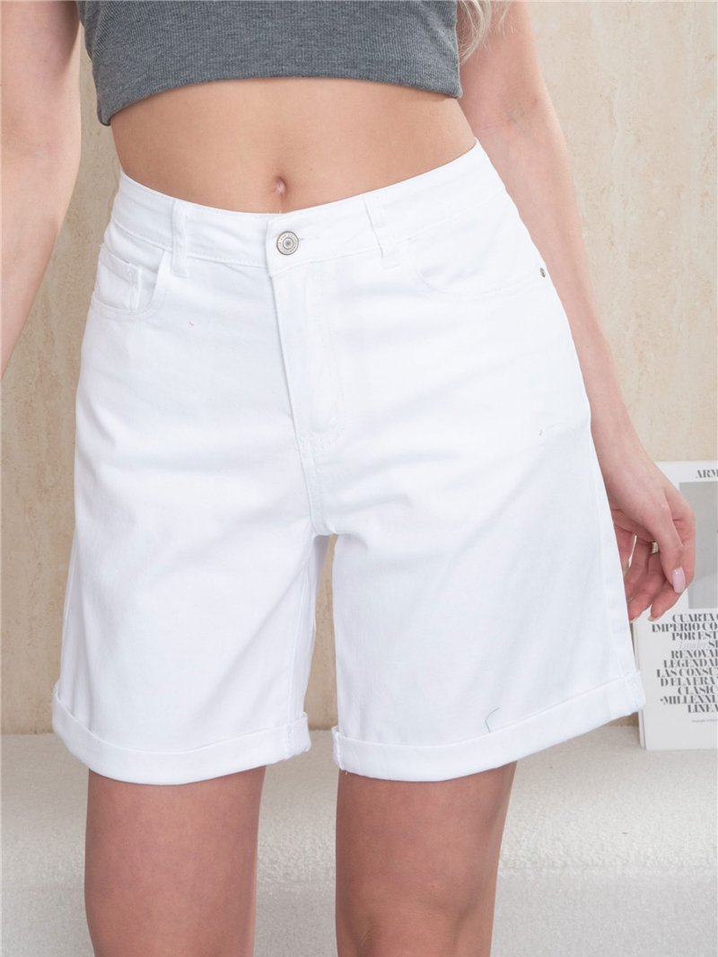 Denim bermuda shorts. Glitter star detail on back pockets. High waist. Five pockets. Rolled hem. Front zip and metal button fastening. Rise 28 cm. Length 43 cm. Hem 29 cm.