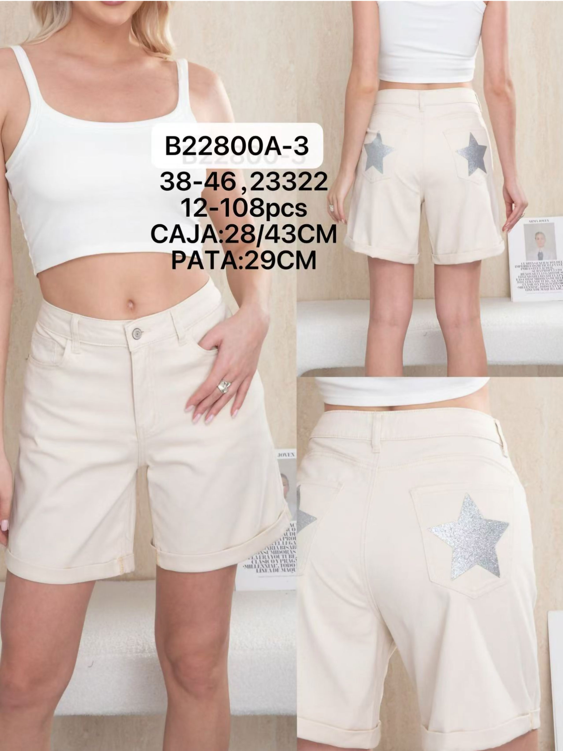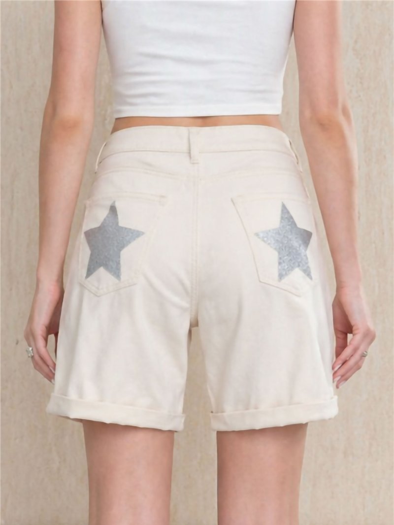 Denim bermuda shorts. Glitter star detail on back pockets. High waist. Five pockets. Rolled hem. Front zip and metal button fastening. Rise 28 cm. Length 43 cm. Hem 29 cm.