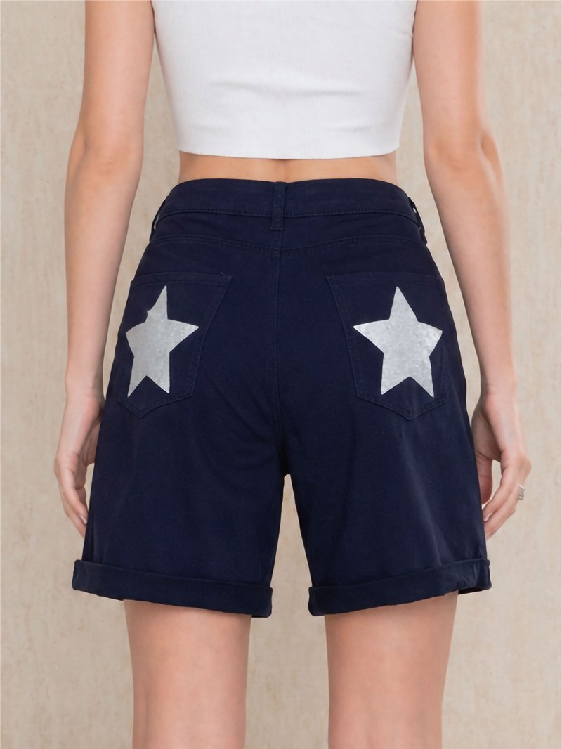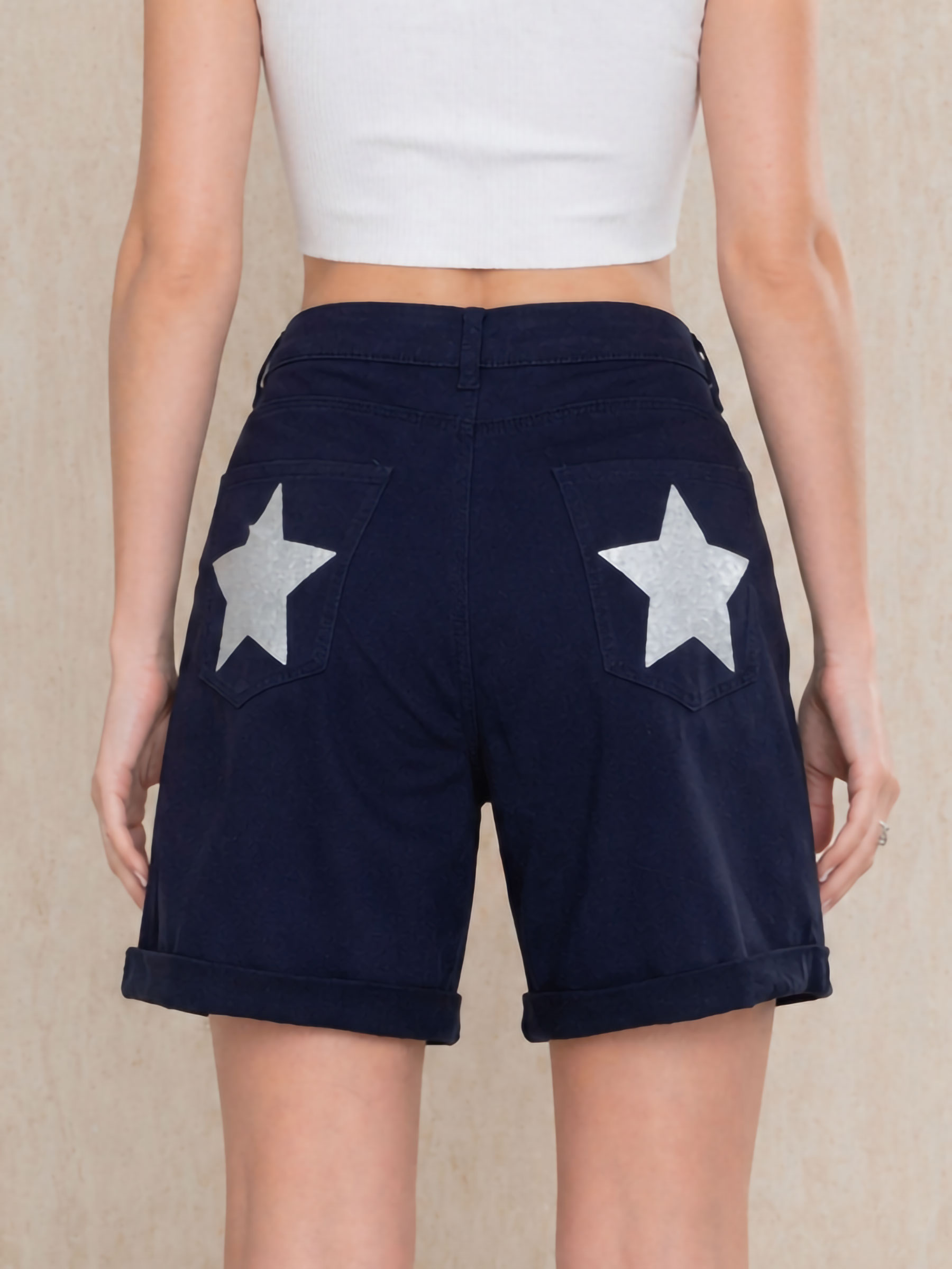 Denim bermuda shorts. Glitter star detail on back pockets. High waist. Five pockets. Rolled hem. Front zip and metal button fastening. Rise 28 cm. Length 43 cm. Hem 29 cm.