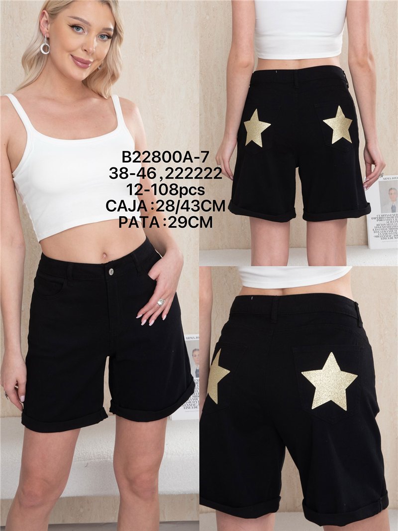 Denim bermuda shorts. Glitter star detail on back pockets. High waist. Five pockets. Rolled hem. Front zip and metal button fastening. Rise 28 cm. Length 43 cm. Hem 29 cm.
