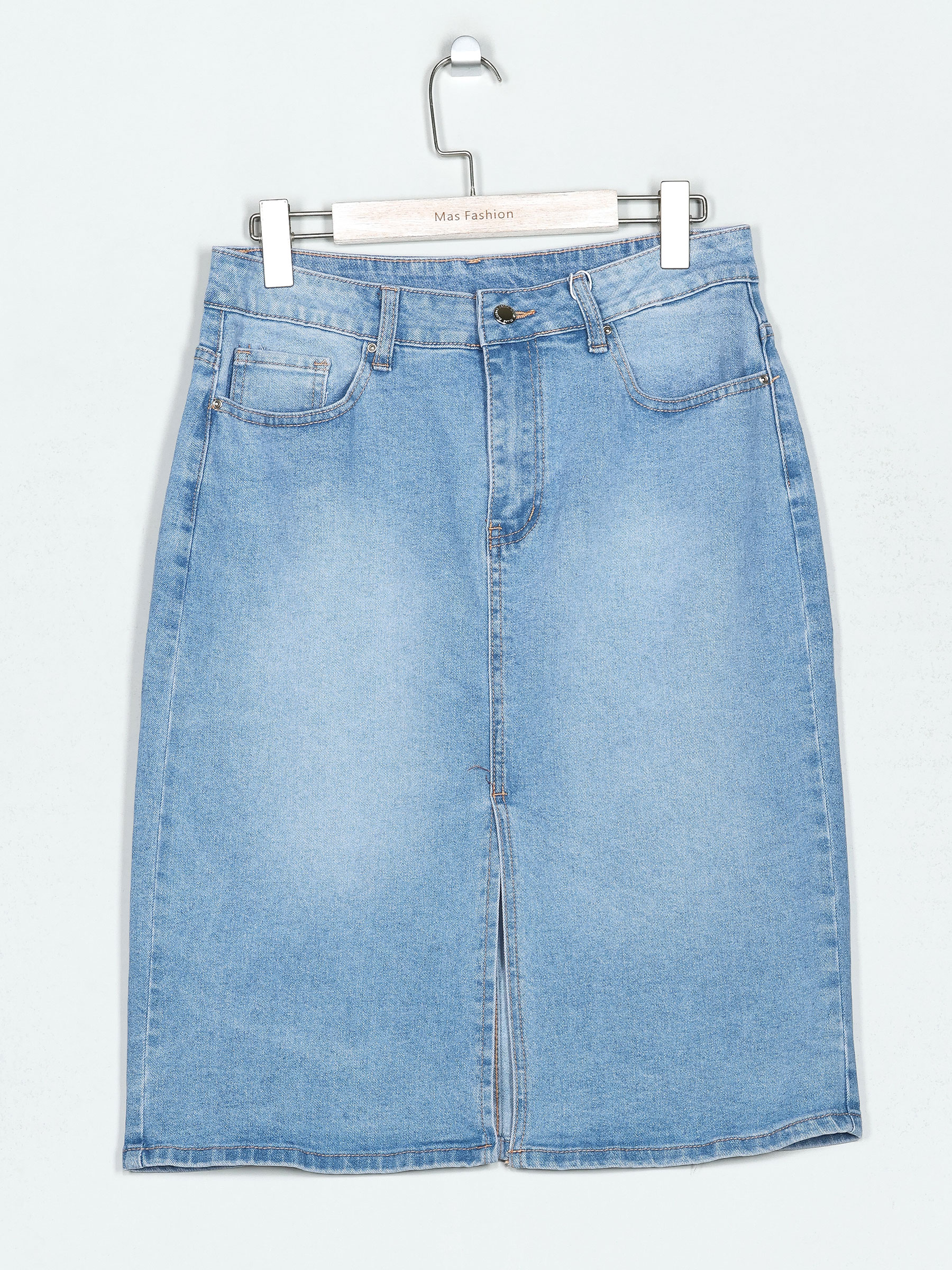 Denim midi skirt with a front vent at the hem. Featuring a five-pocket design and zip fly and metal top button fastening in the front.