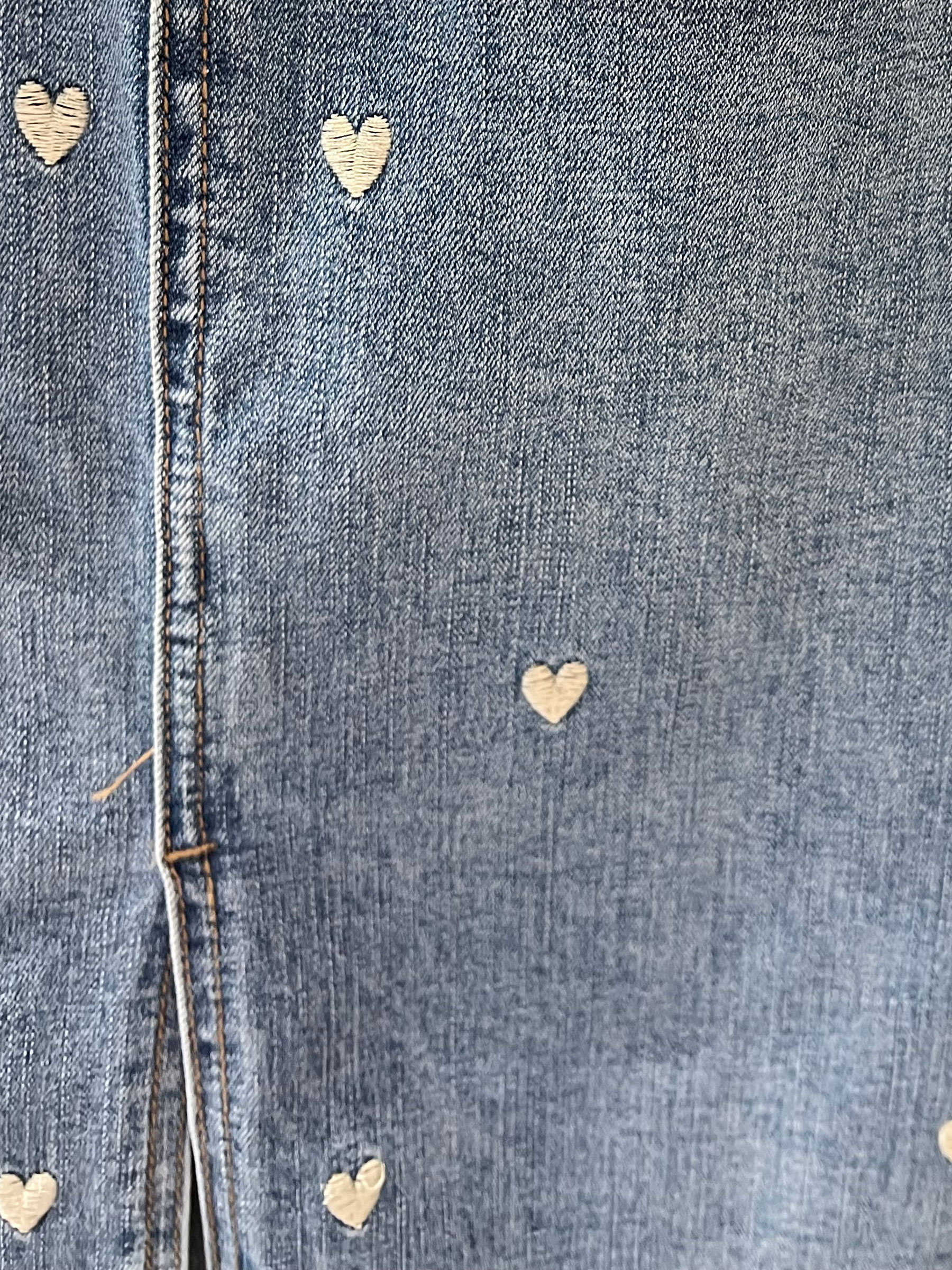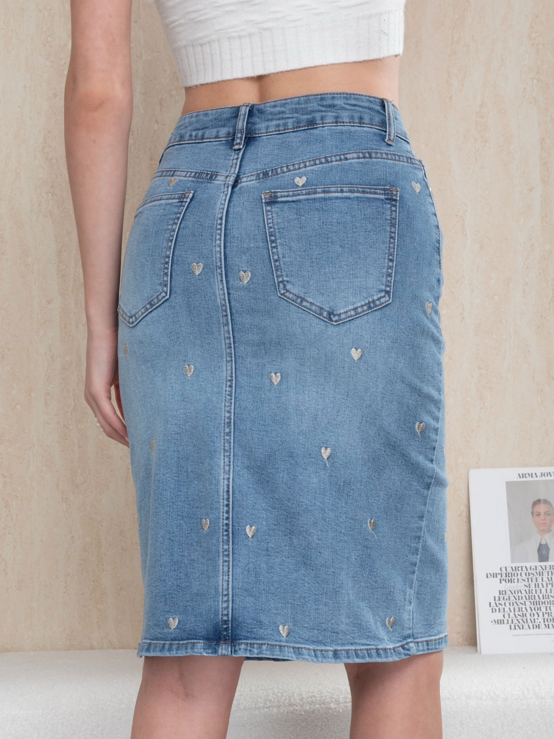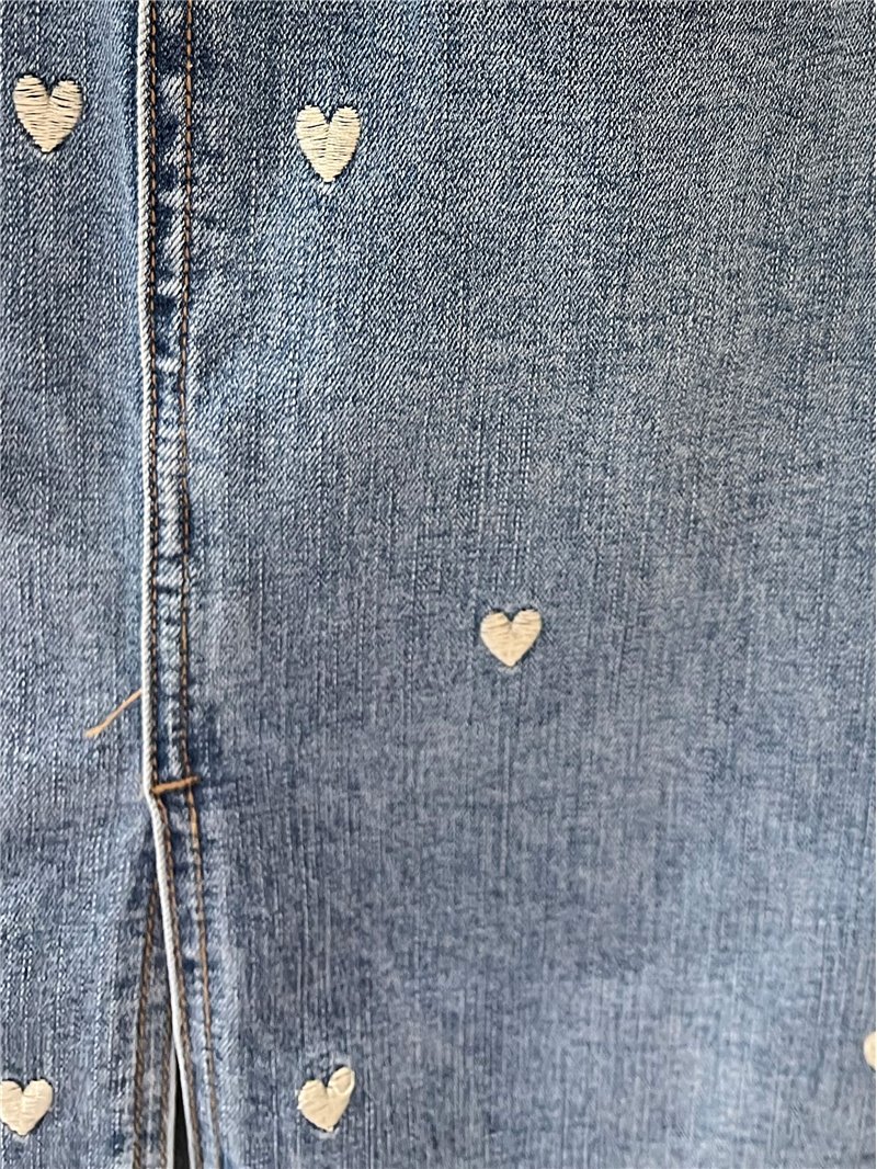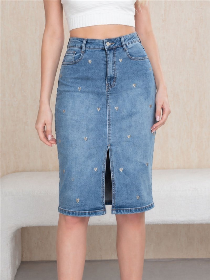 Denim midi skirt. Embroidered heart detail. Front slit. Five pockets. Front zip and metal button fastening. Length 62 cm.