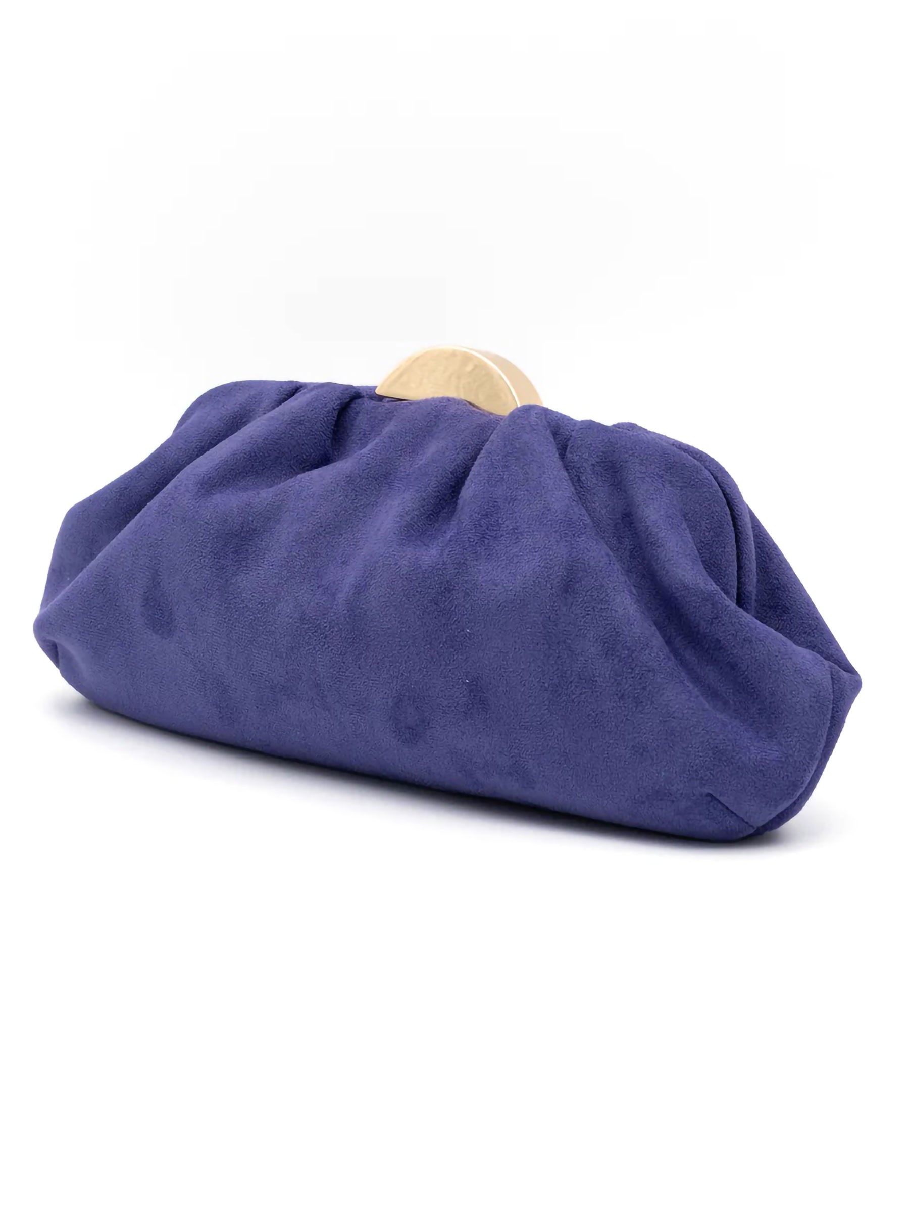 Clutch bag. Suede effect. Chain shoulder strap. Lined interior with pocket. Gold metal clasp closure.