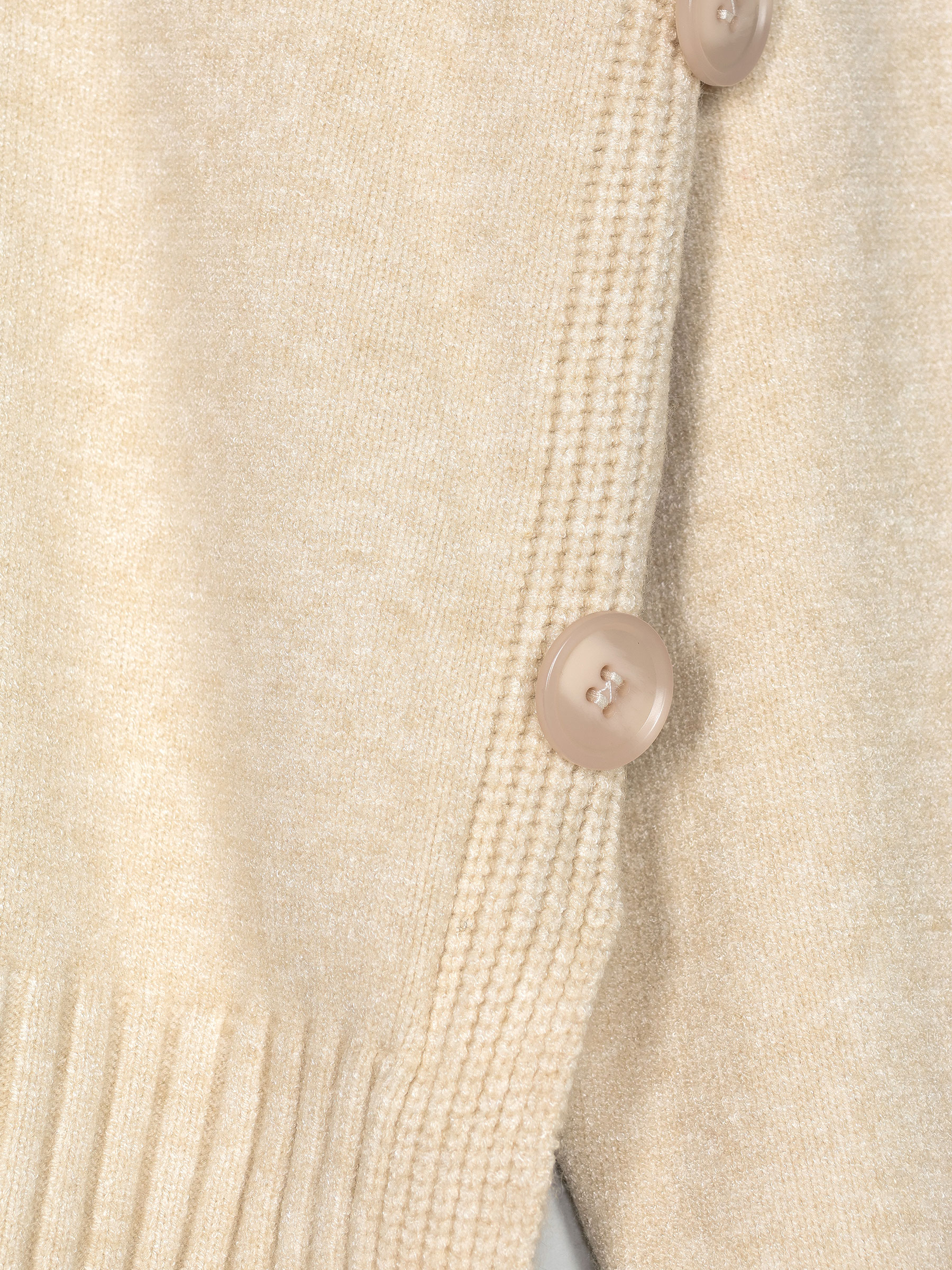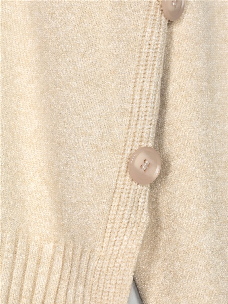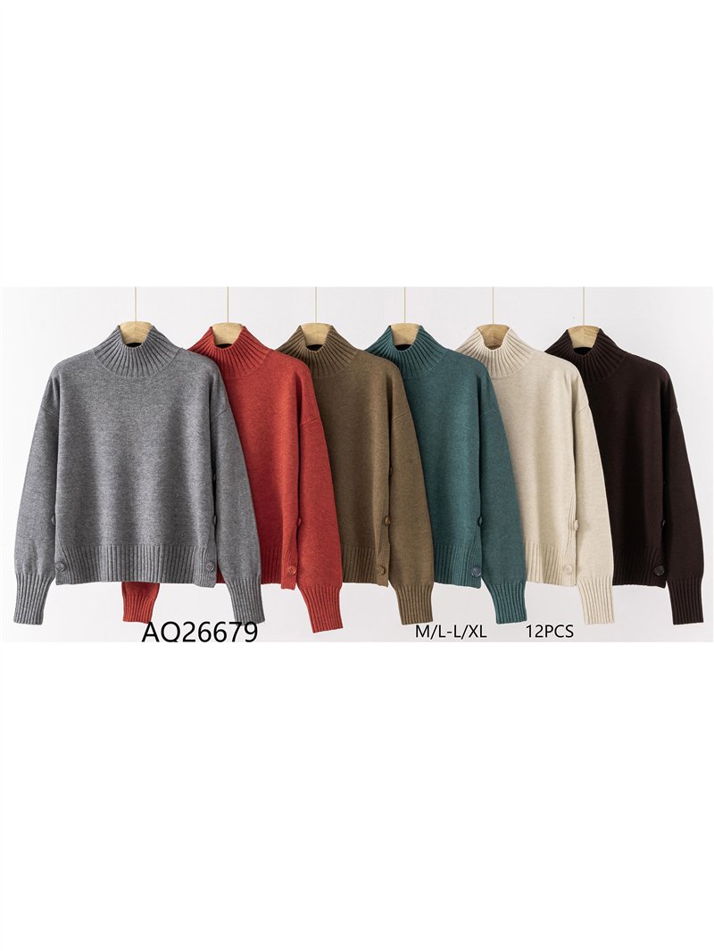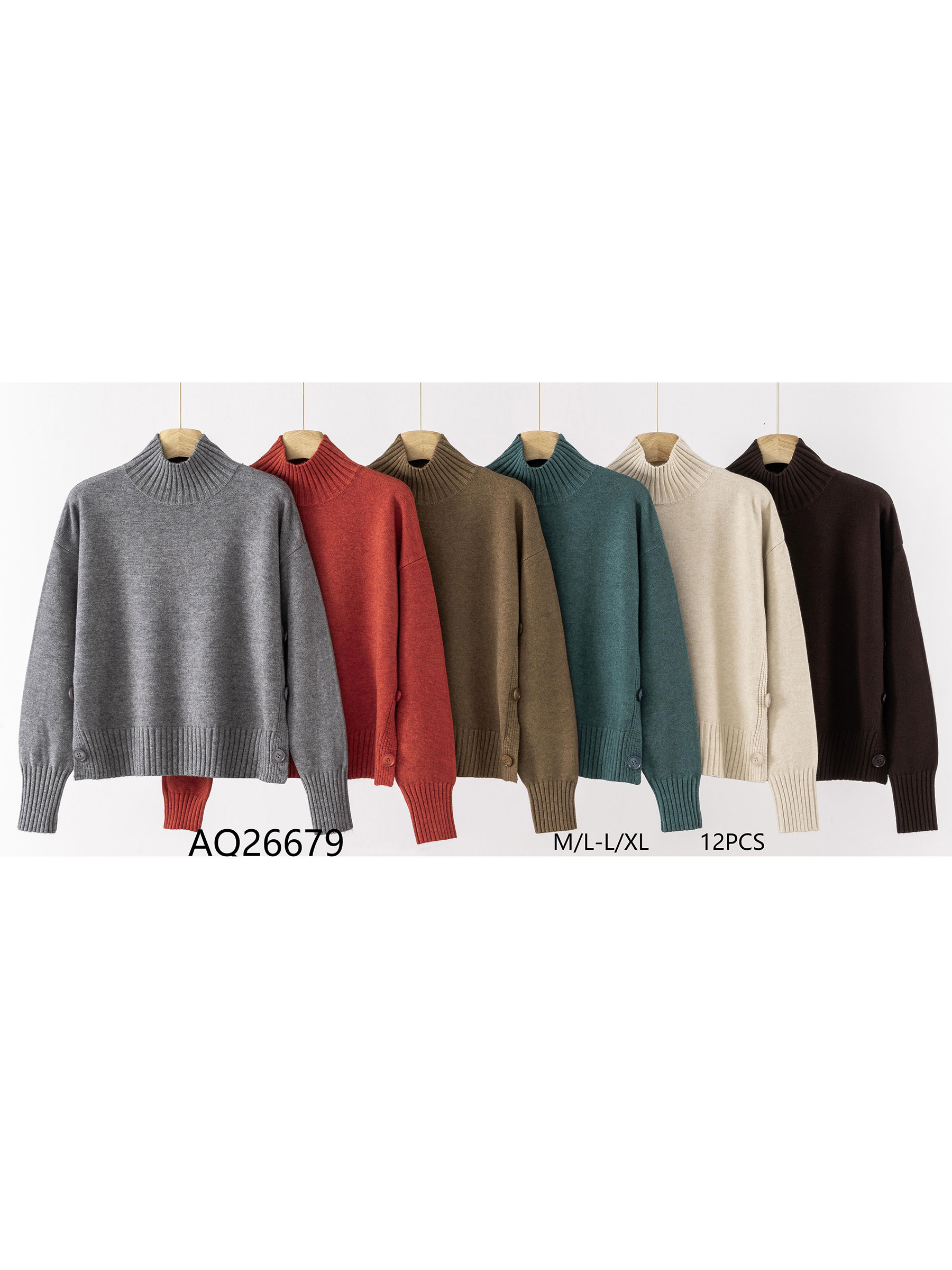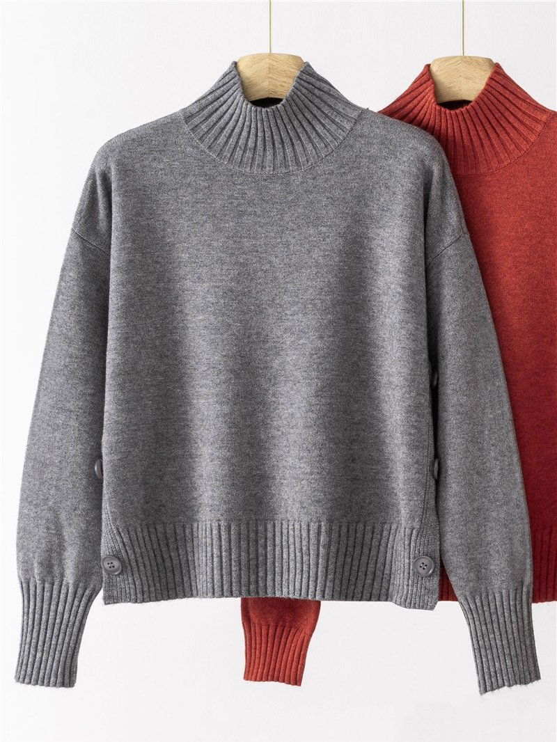 High neck knit sweater with long sleeves. Featuring buttons detail, side vents at the hems and ribbed trims.