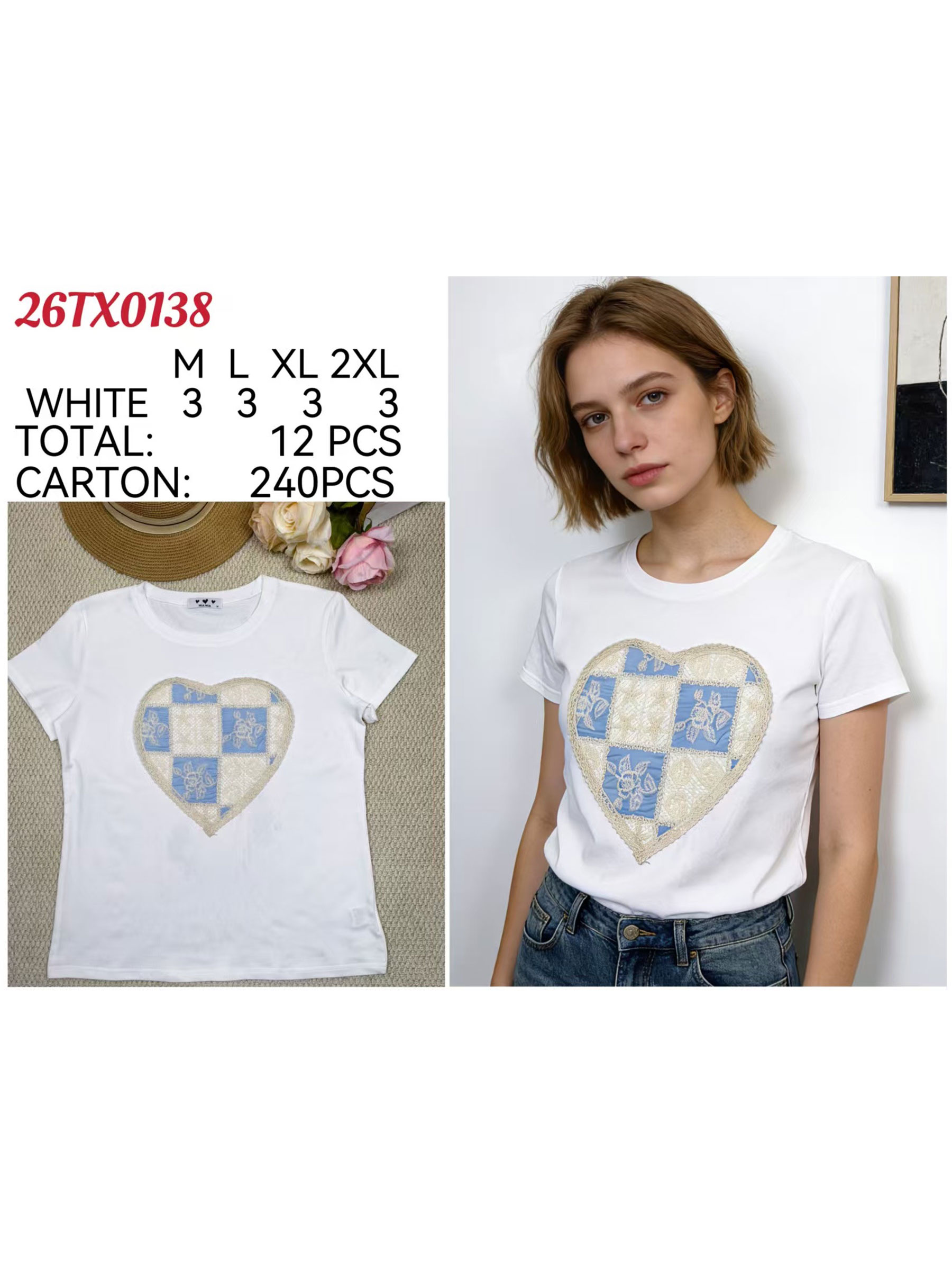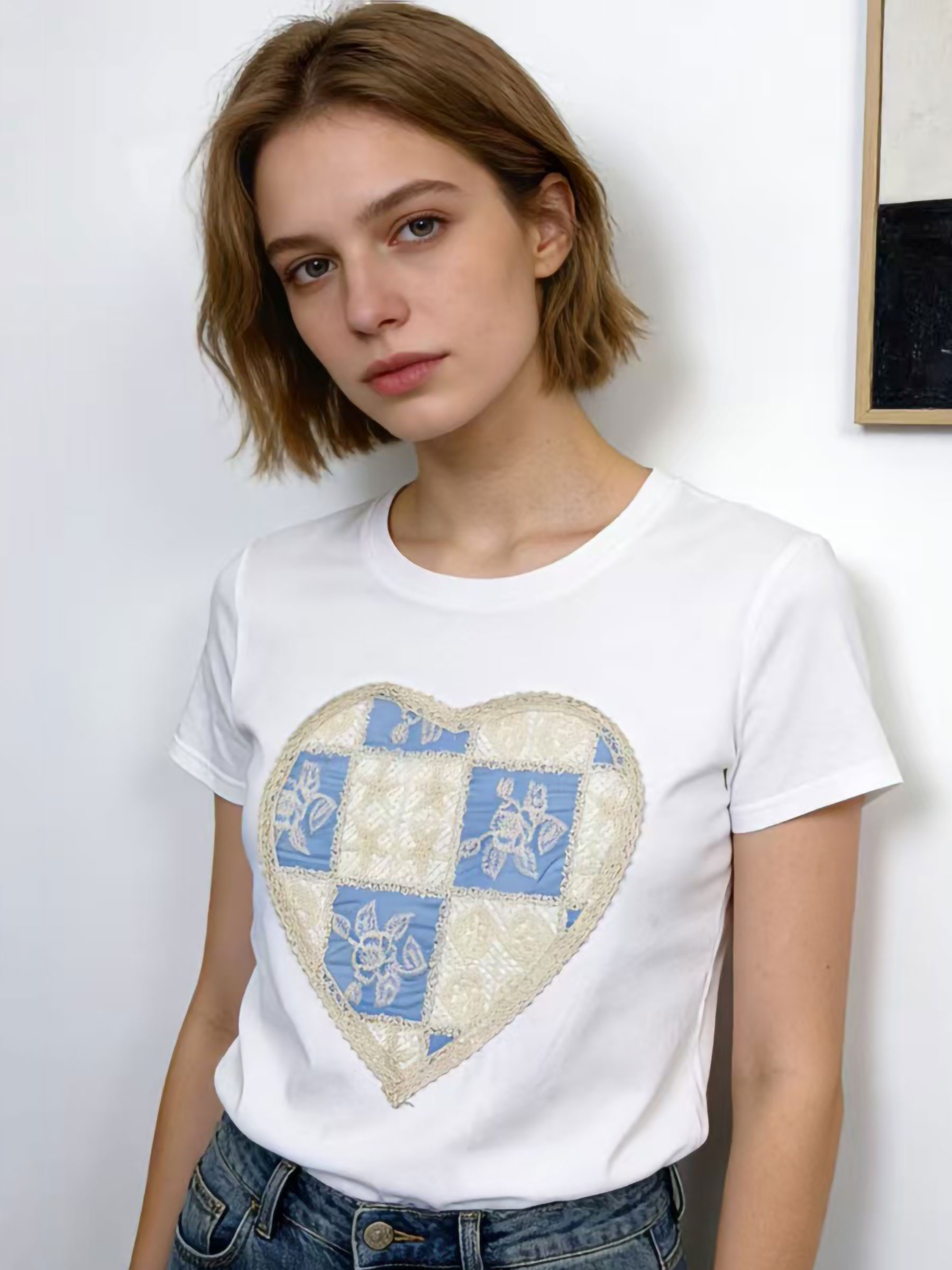 Basic t-shirt. Patchwork heart applique with lace detail. Round neck. Short sleeves. Stretchy fabric.