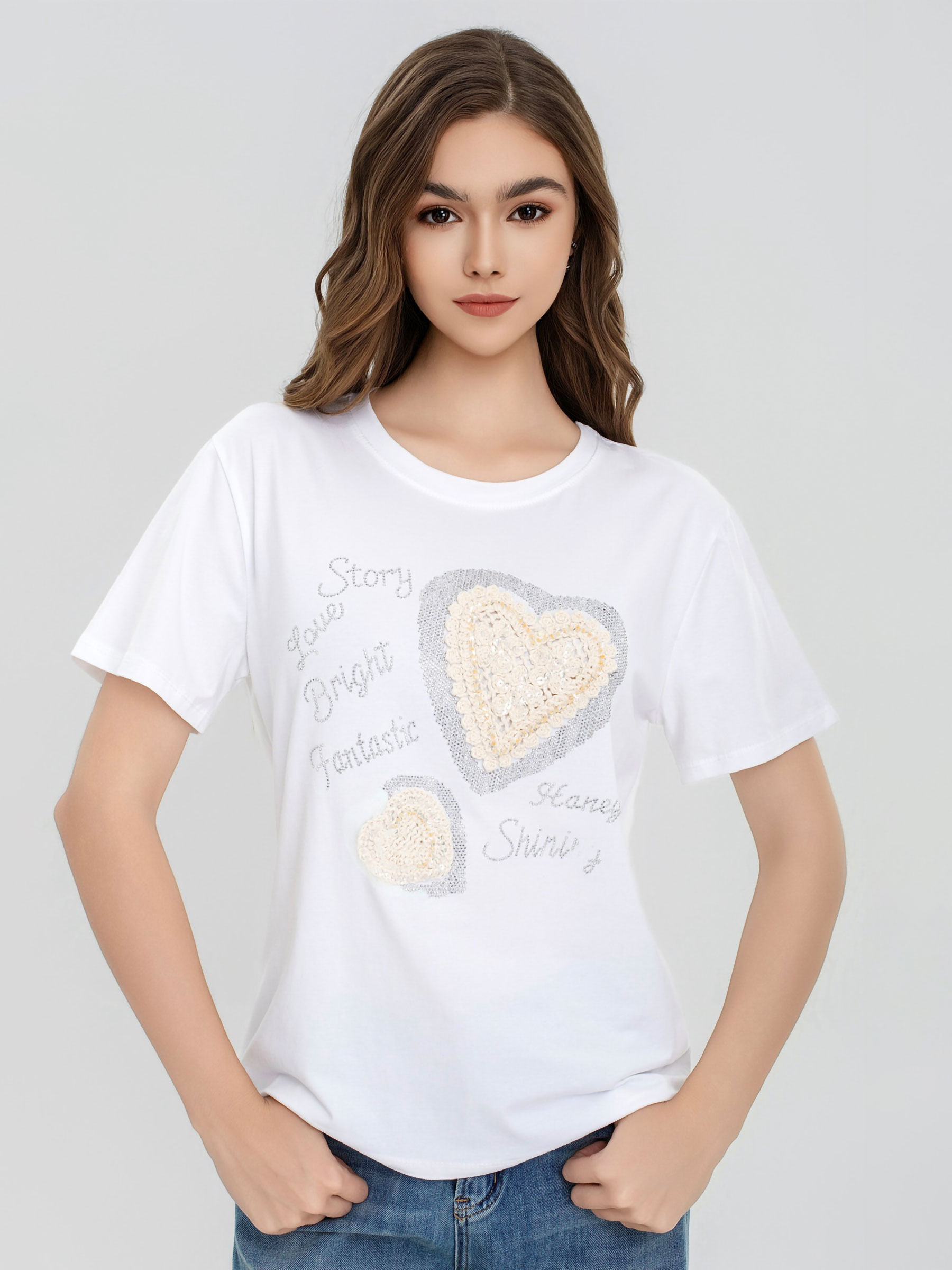 Min. 10 T-shirts Lace heart applique t-shirt JS-26TX0119 Heart applique t-shirt. Lace detail. Round neck. Short sleeves. Stretch fabric.Collection: Spring/Summer 2026 See price