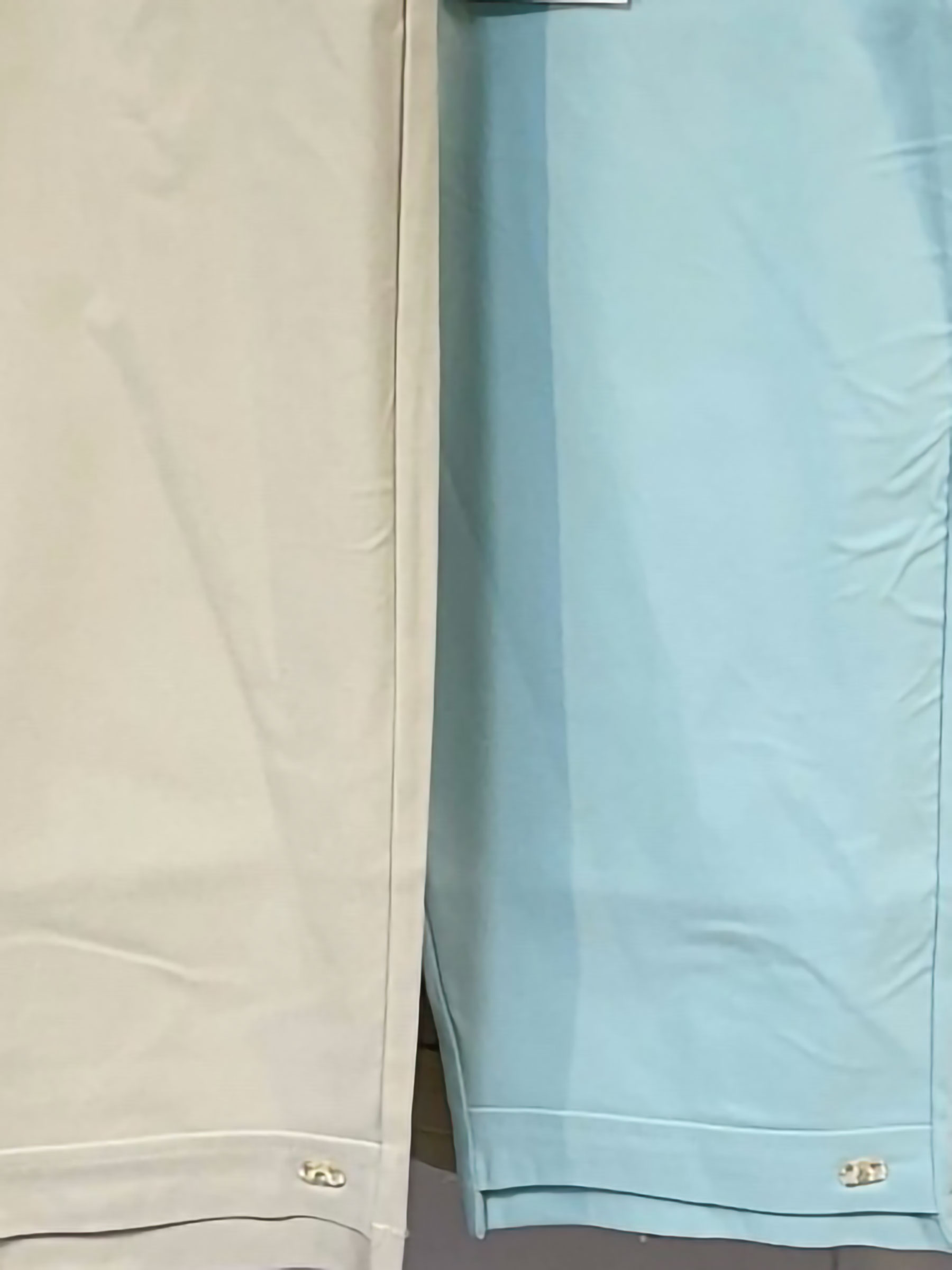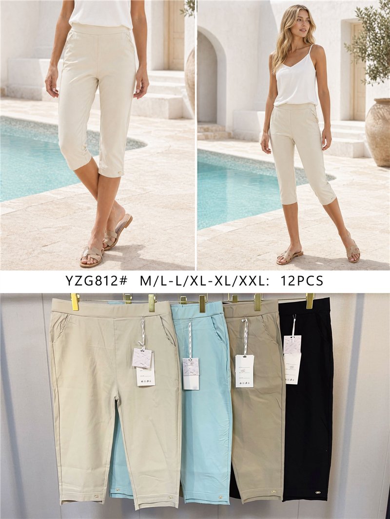 Solid capri trousers. Side pockets. Metal detail at hem. Stretch fabric.