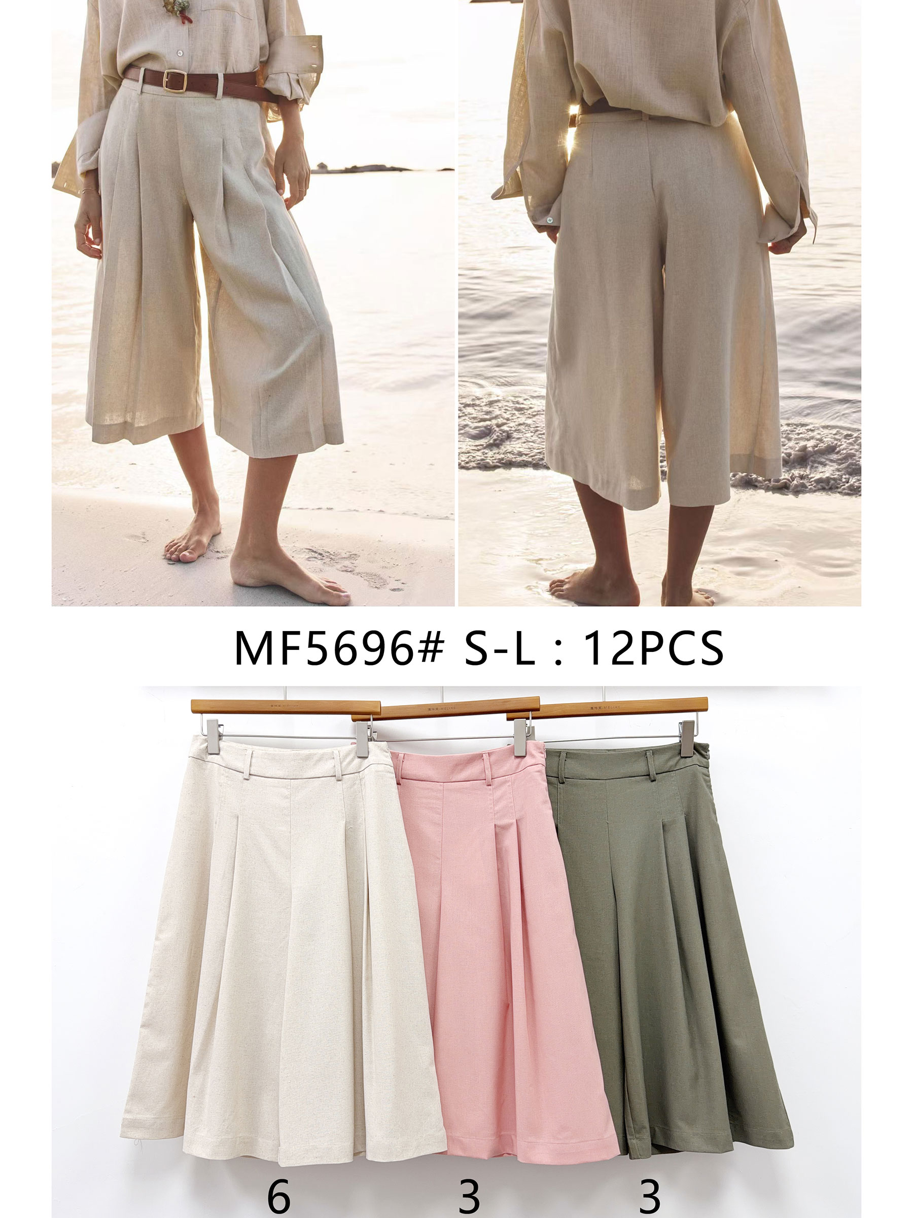 Culotte trousers. Linen look fabric. Front pleats. Belt loops. Wide leg.
