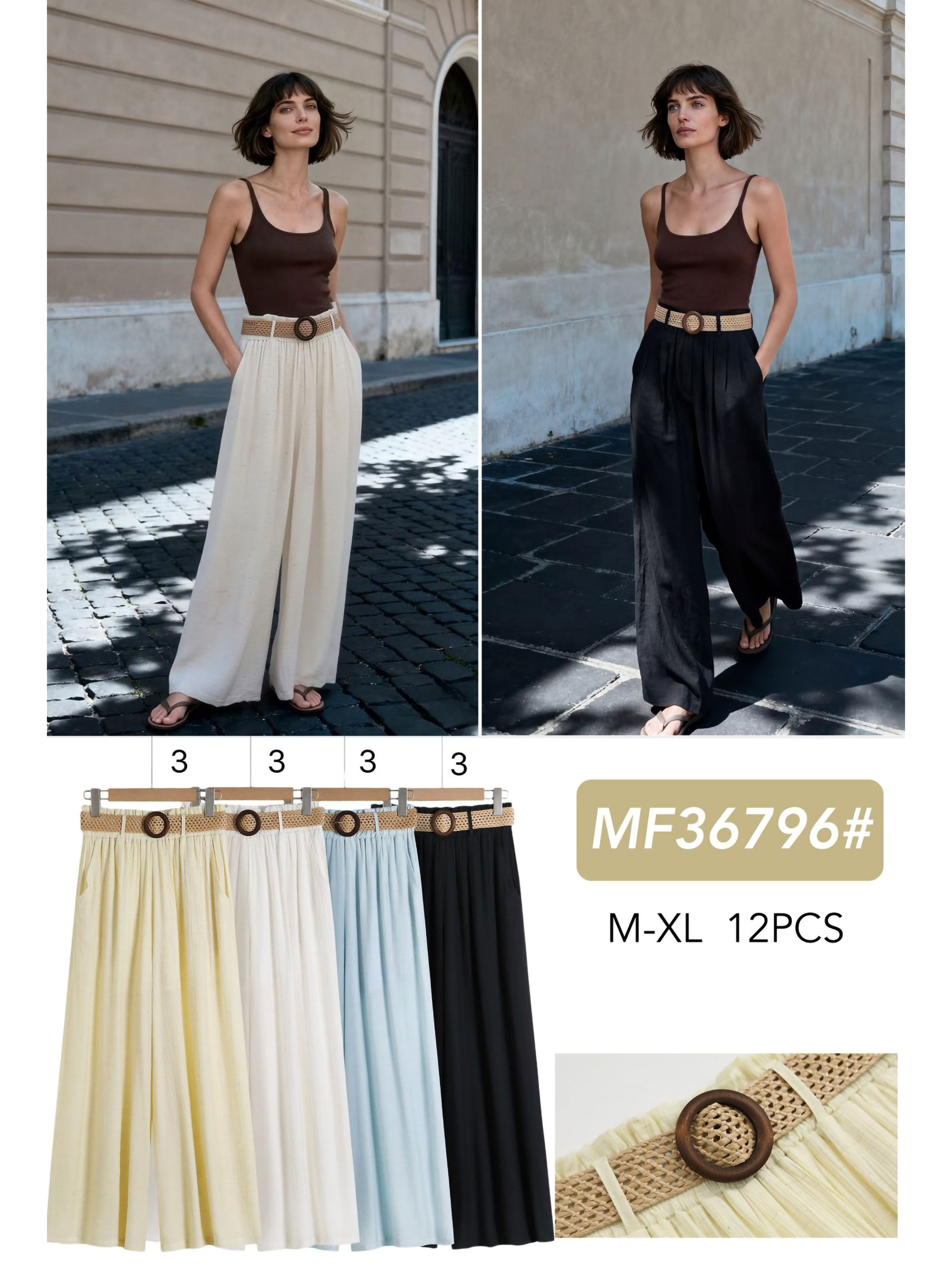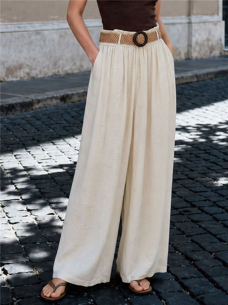 Wide leg linen-look trousers. Elastic waist. Braided belt included. Side pockets.