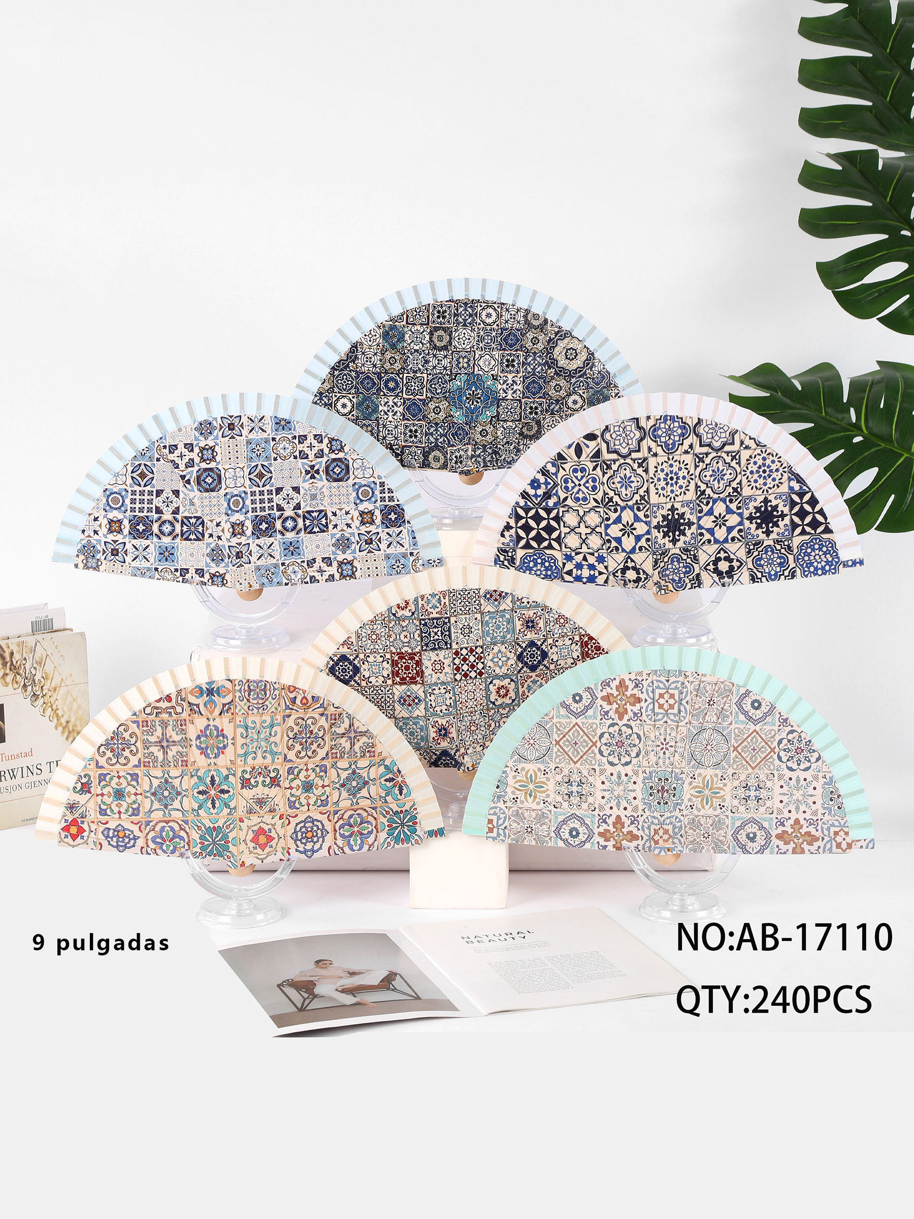 Abanico de madera. Estampado mosaico tipo azulejo. 1 cara. 9 pulgadas. Diseños surtidos.