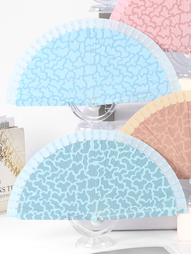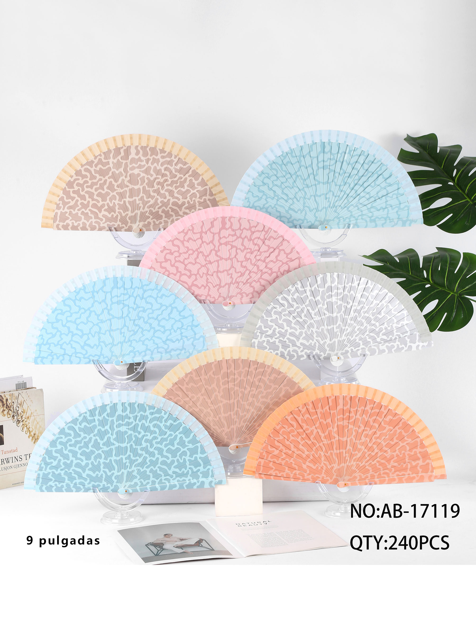 Abanico de madera. Estampado geométrico. 1 cara. 9 pulgadas. Colores surtidos.