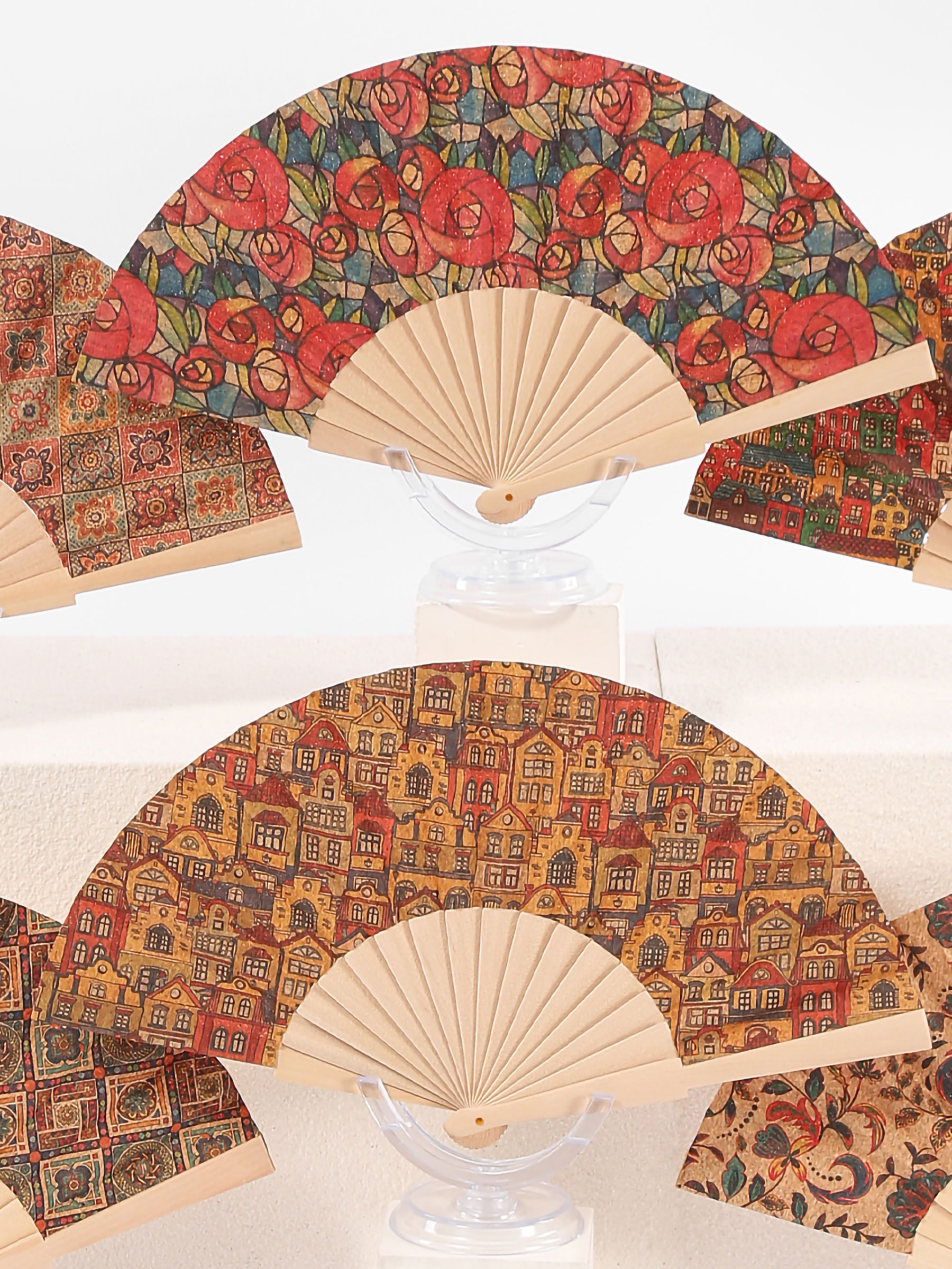 Abanico de madera estampado con diseño patchwork vintage. 1 cara. Colores surtidos.