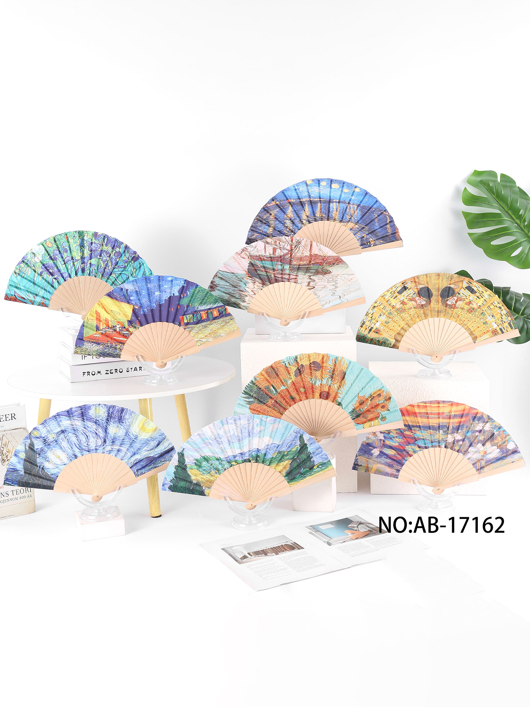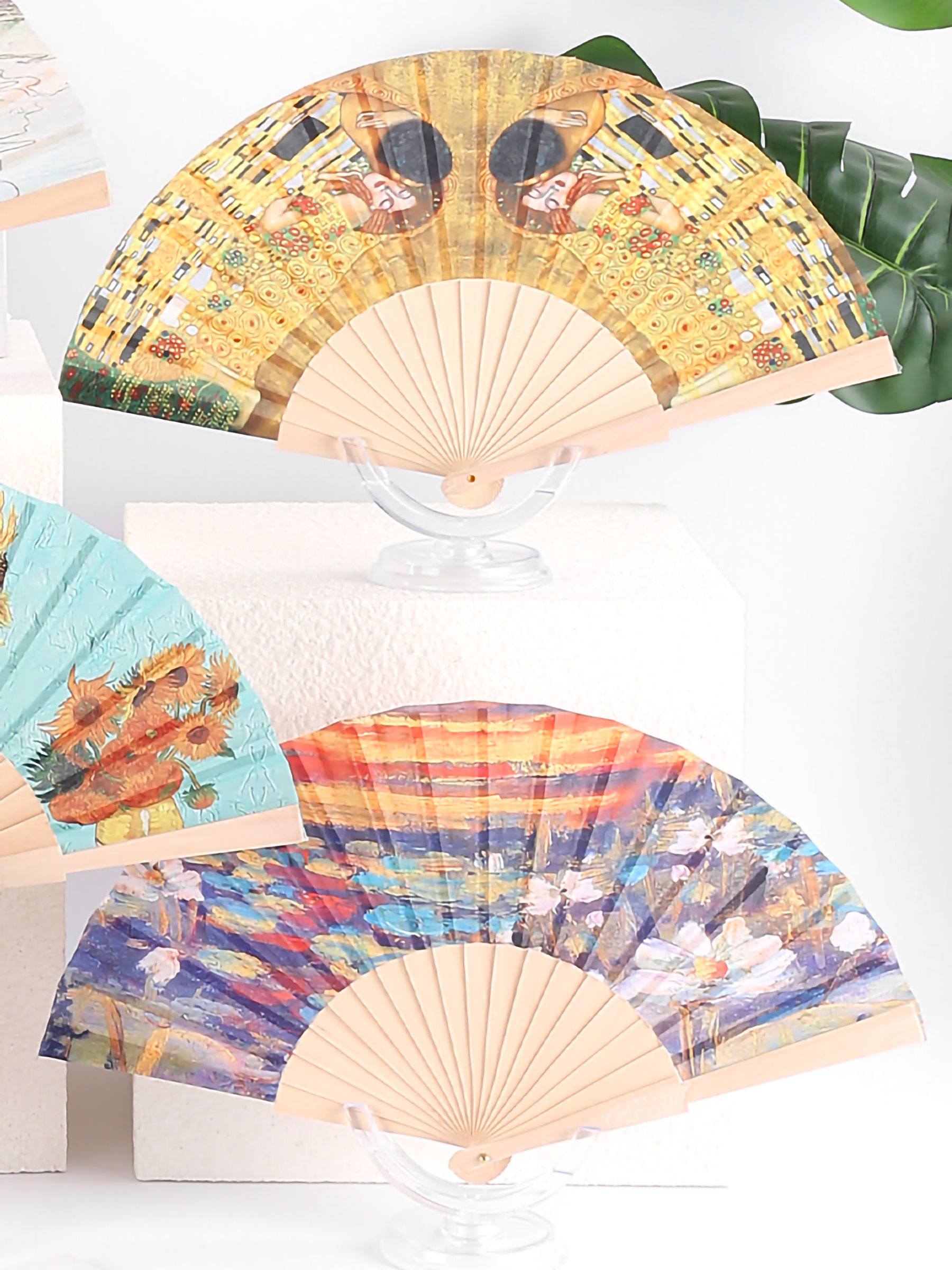 Abanico madera con tela estampada. 1 cara. 7 pulgadas. Colores surtidos.