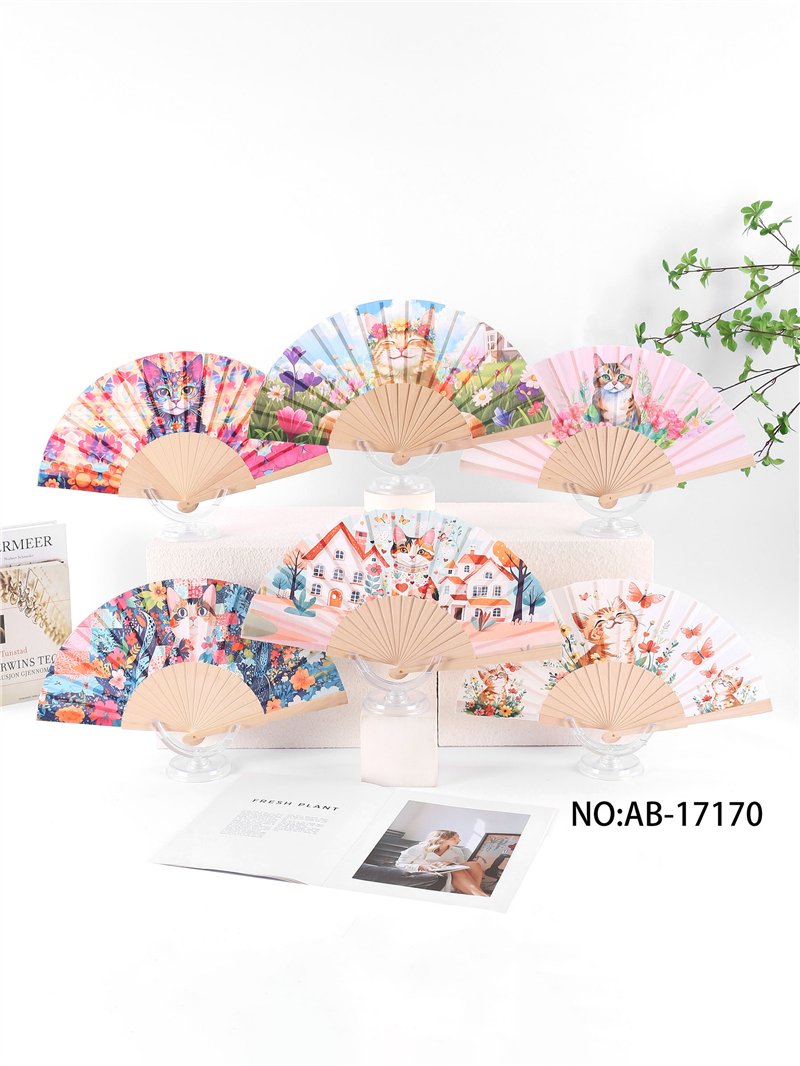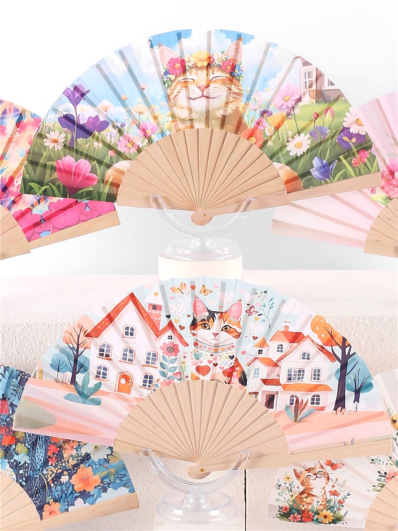 Abanico madera con tela estampada. 1 cara. 7 pulgadas. Colores surtidos.