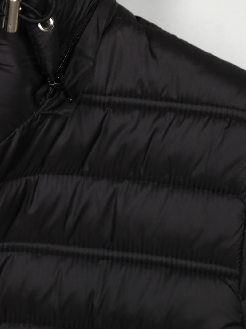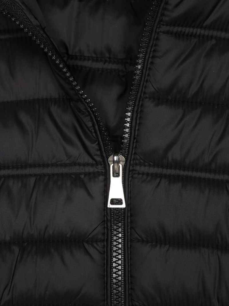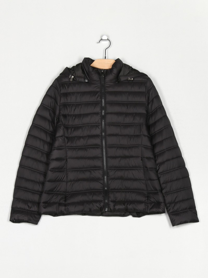 Chaqueta corta ultra ligera. Acolchada. Capucha desmontable. Bolsillos con cremalleras invisibles. Cuello subido. Manga larga. Cierre de cremallera central.
